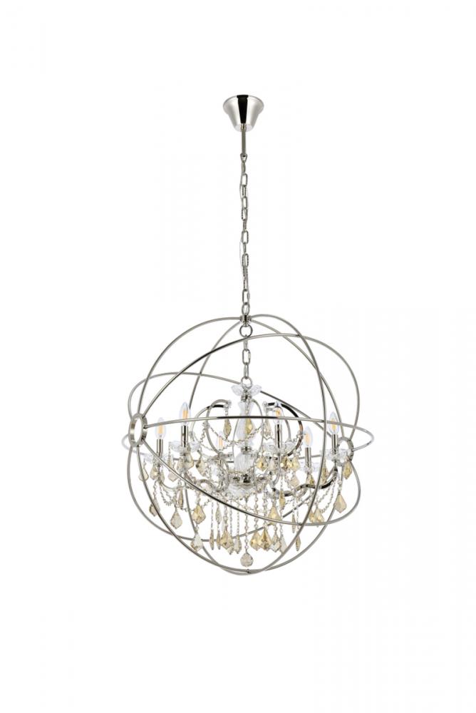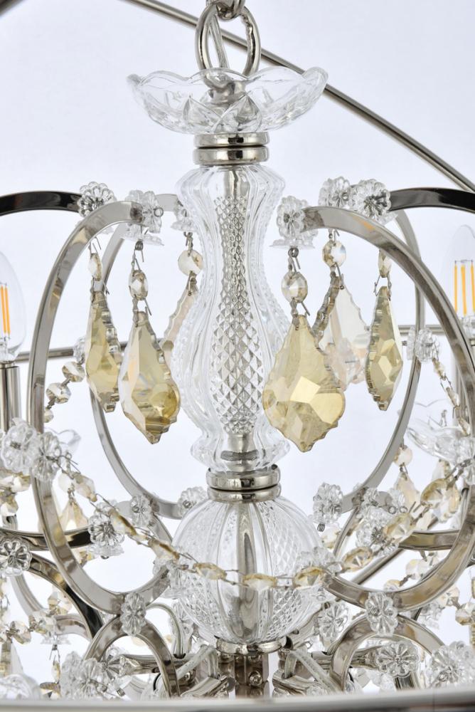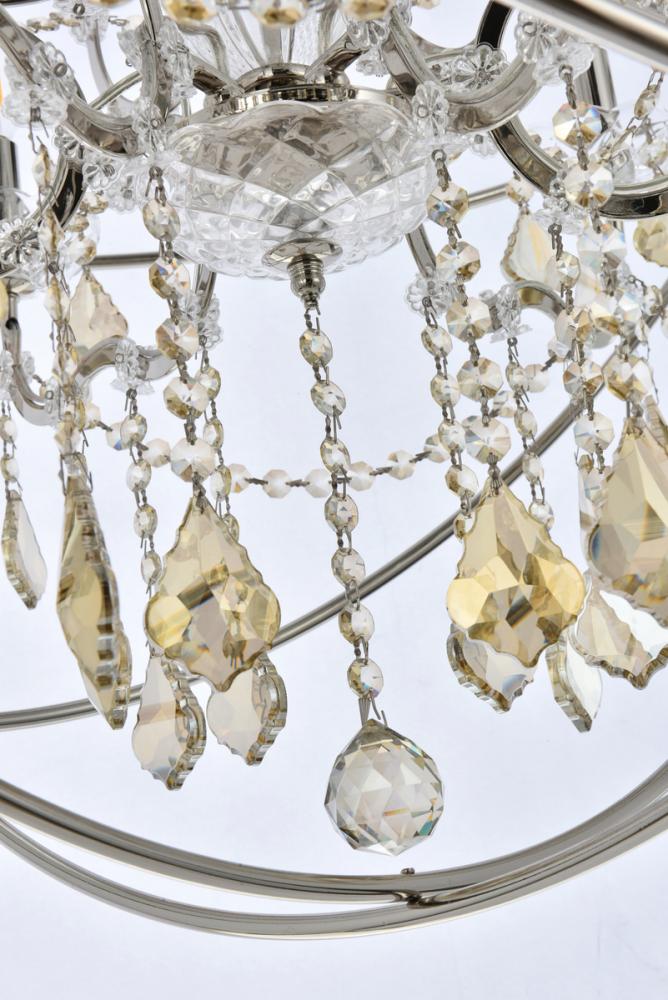 Royal-cut golden-teak crystals and six candelabras beautifully complement the polished-nickel finish