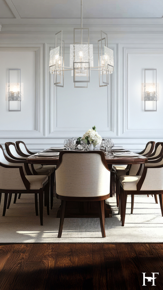 A juxtaposition of unique textured clear glass elements with tall vertical modern steel structures achieved the clean, contemporary lines that designer Ori Goldberg was seeking. The Geo 6-Light Pendant is perfect either alone or in multiples, making it easily adaptable to many spaces.