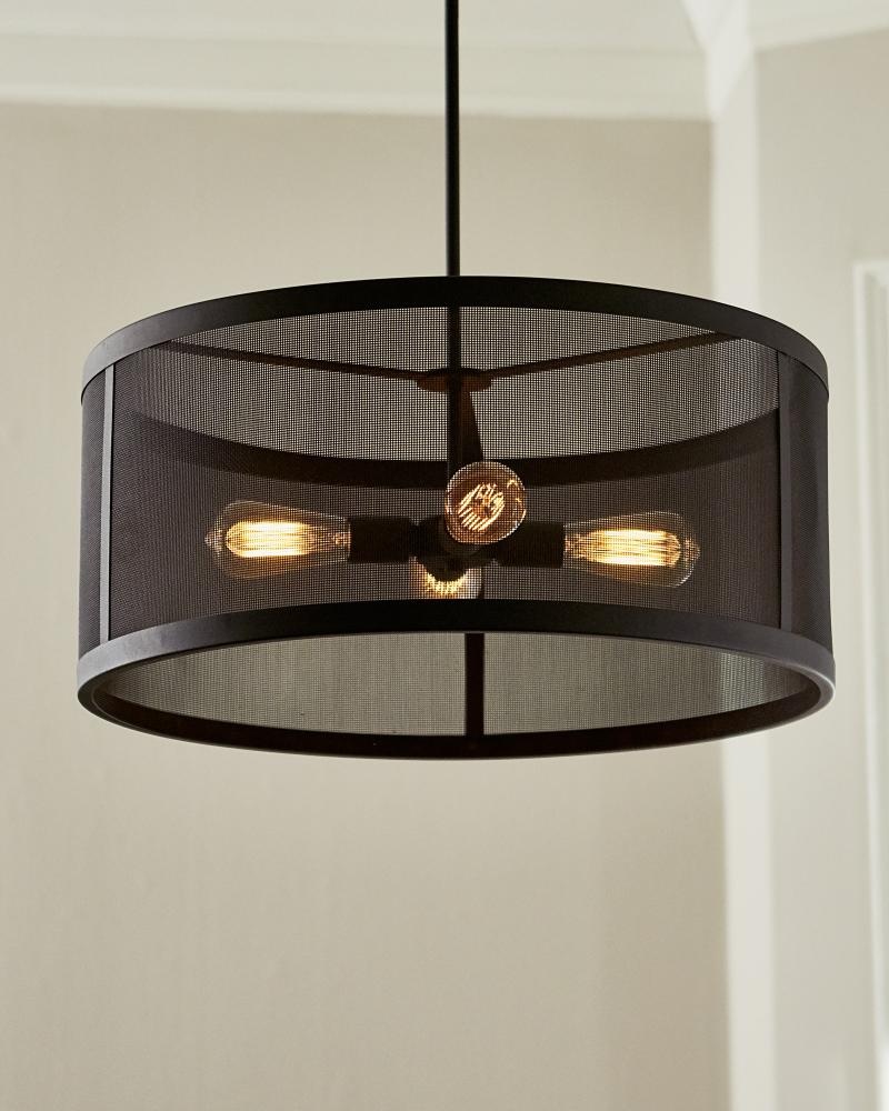 The Gereon four light indoor pendant in black supplies ample lighting for your daily needs, while adding a layer of today's style to your home's décor. A distinctive mesh lampshade in the Gereon Collection harkens back to the industrial days of machine innovation, adding a rugged look of workmanship that transforms an interior's identity. At once stylistic and utilitarian, Gereon is available in a finely textured Black finish with medium base sockets. The muted glow of the bulbs beneath the mesh framing adds a rugged personality. The versatile Gereon fixtures are damp rated for covered outdoor installations as well. Available as a 1-light mini-pendant, 3-light and 4-light pendants, 2-light semi-flush ceiling mount, and 1-light wall sconce to adapt interior settings in a variety of ways.
