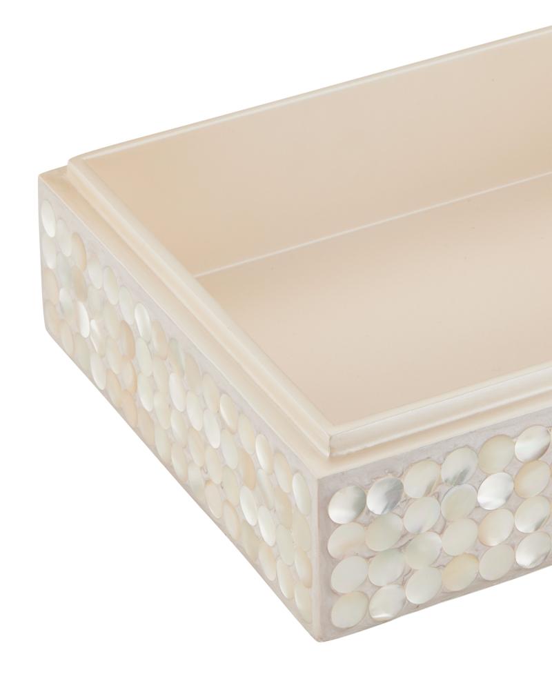 A shimmering duo of compositions, the Gerri Dot Box Set includes two white decorative boxes covered in tiny circlets of mother of pearl. The process of placing the material so uniformly on the sides and the top of these boxes is a painstaking process that takes hours to complete. The circlets are held in place by the composite into which they are set. The intermingling of crisp white and pale ivory pieces of shell brings these boxes added texture.