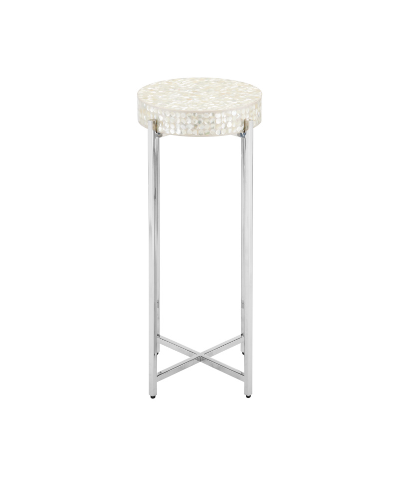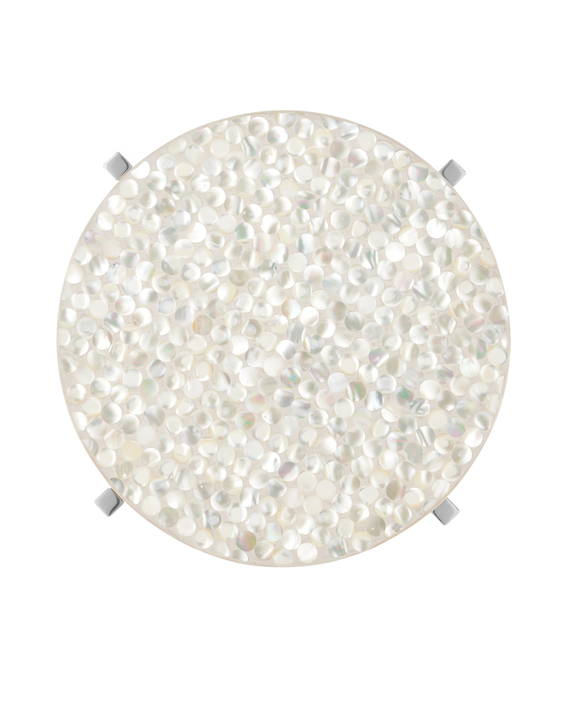 The Gerri Dot Mother-of-Pearl Drinks Table has a top covered in gleaming pieces of shell that have been expertly placed to cover the round disc inset into the metal frame like a gem. Four legs made of stainless steel in a polished nickel finish are connected by an ex-shaped stretcher. The silver and white drinks table stands just over 23 inches tall and is 11 inches in diameter, which makes it ideal for rooms where space is limited.