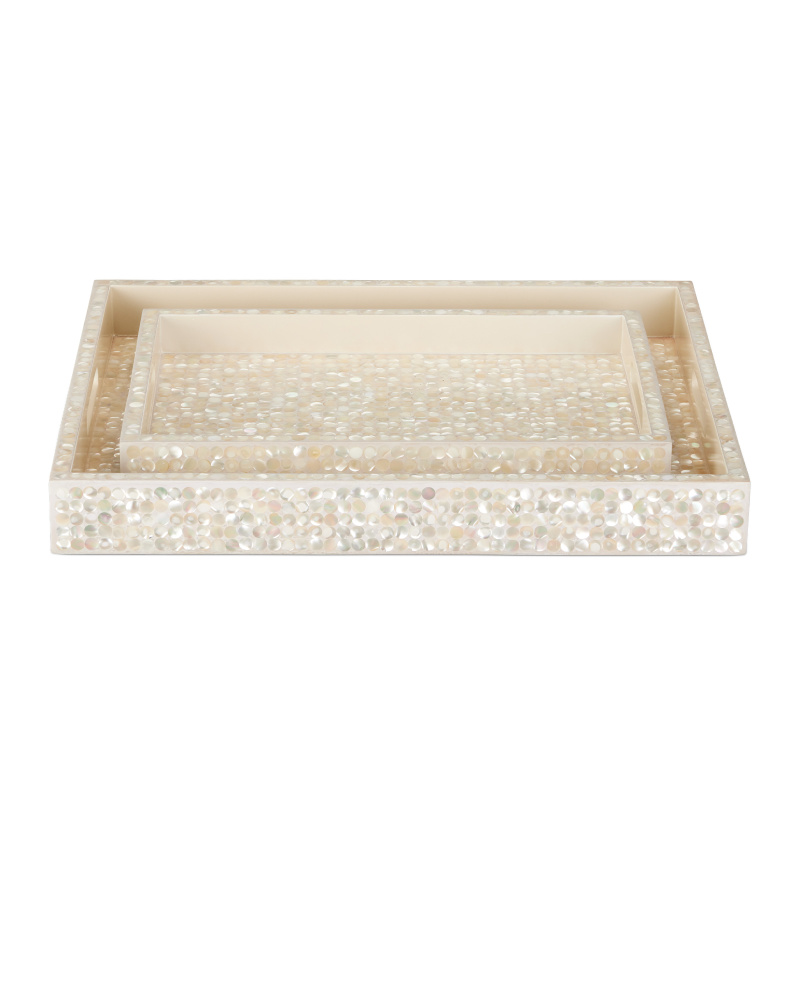The luxuriousness of mother-of-pearl has been prized in interiors through the ages, and the Gerri Dot Tray Set, which includes a larger and smaller decorative tray, is a fine example of the artisanship that has given the material lasting appeal. Made of wood, the pair of larger-than-average trays are made of gleaming pieces of shell, which have been expertly placed along the sides, tops, and bottoms of the trays. These trays are not food safe and cold nor hot items should not be placed directly on them.
