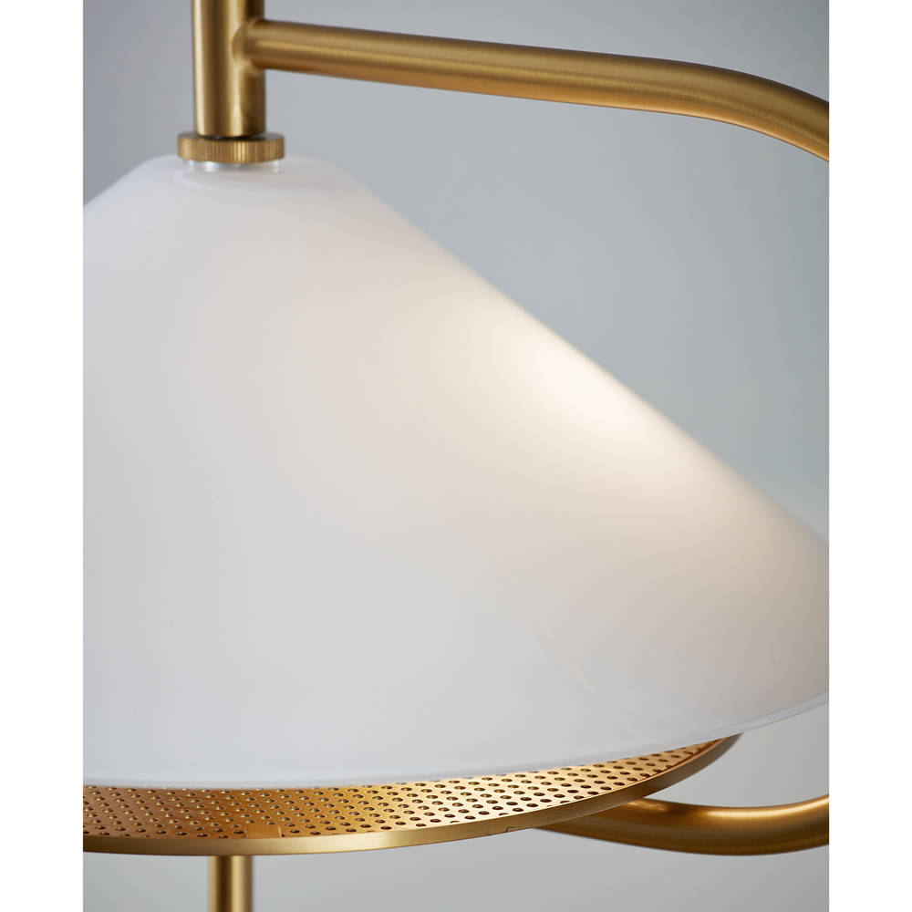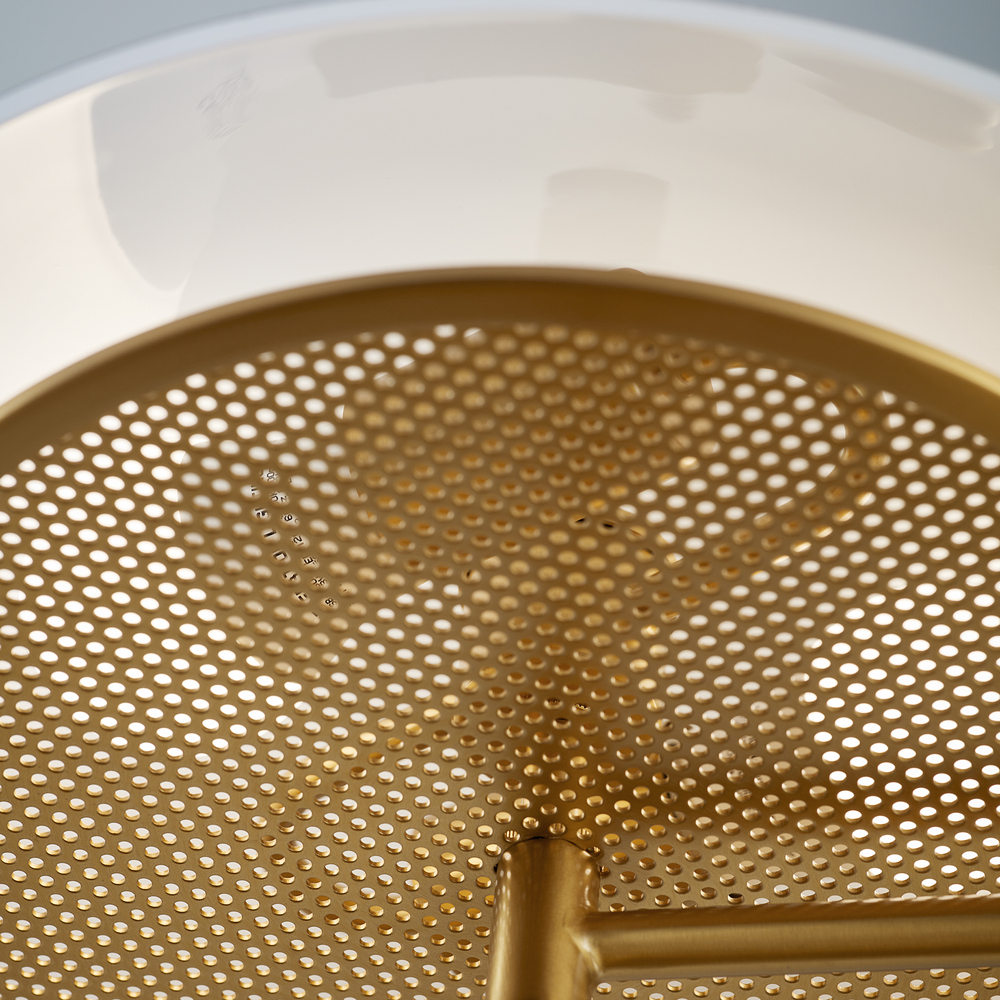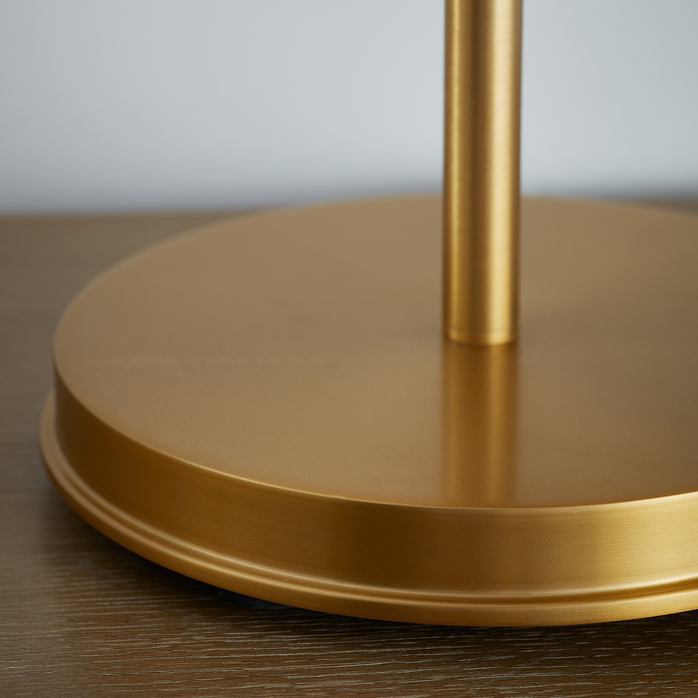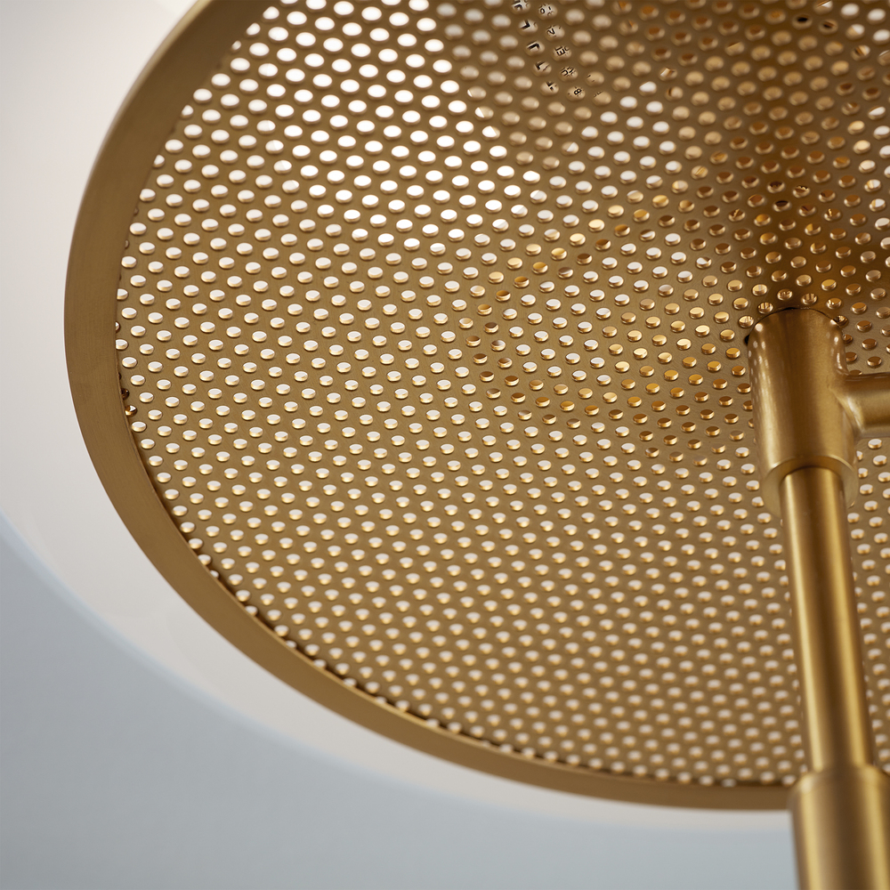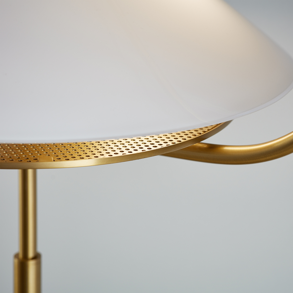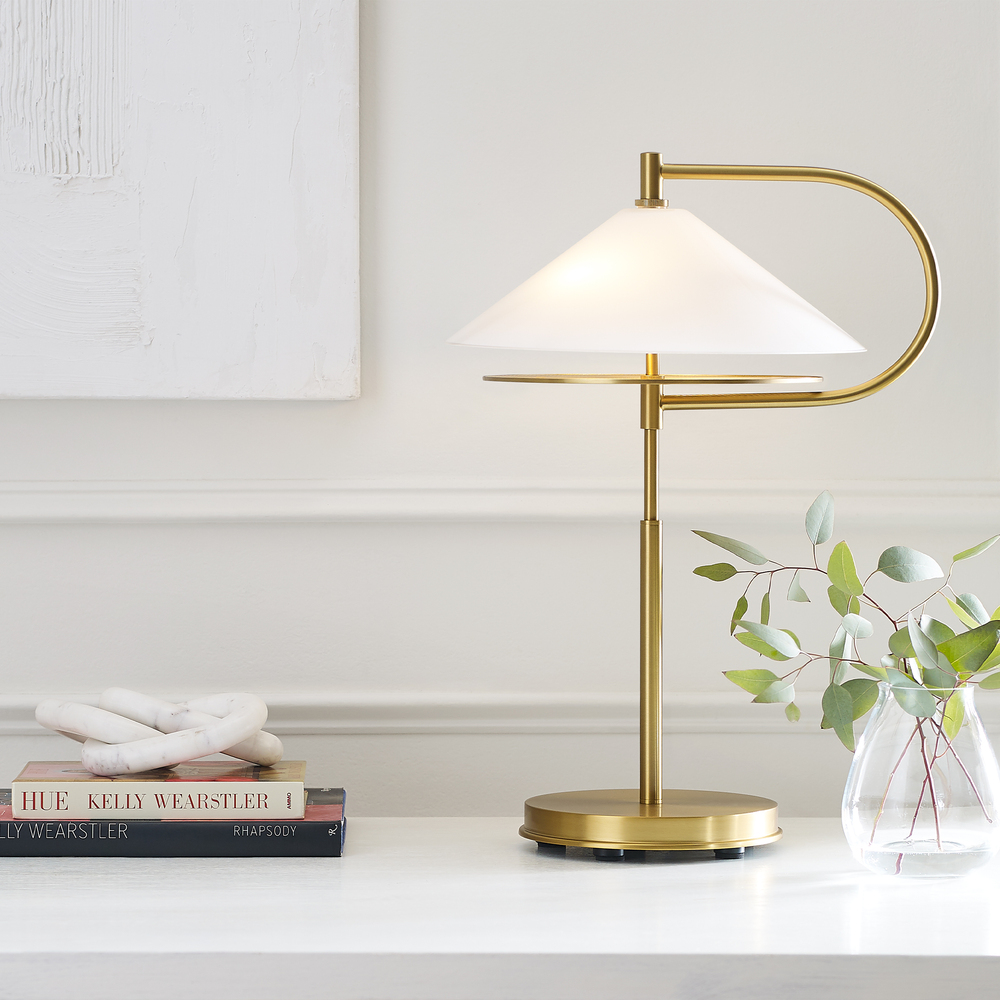 The Gesture table lamp by Kelly Wearstler offers a dramatic and architectural take on Kelly’s signature use of mixed metals and geometric forms, Gesture gives the appearance of asymmetrical balance. Gesture juxtaposes organic feminine curves with sleek masculine precision. The “C” arm hook holds an opal glass shade with a perforated metal diffuser at the base of the lamp. The diffuser shines light straight out and down, ensuring gentle, even distribution of the light. Available in two finish options: Burnished Brass and Midnight Black.