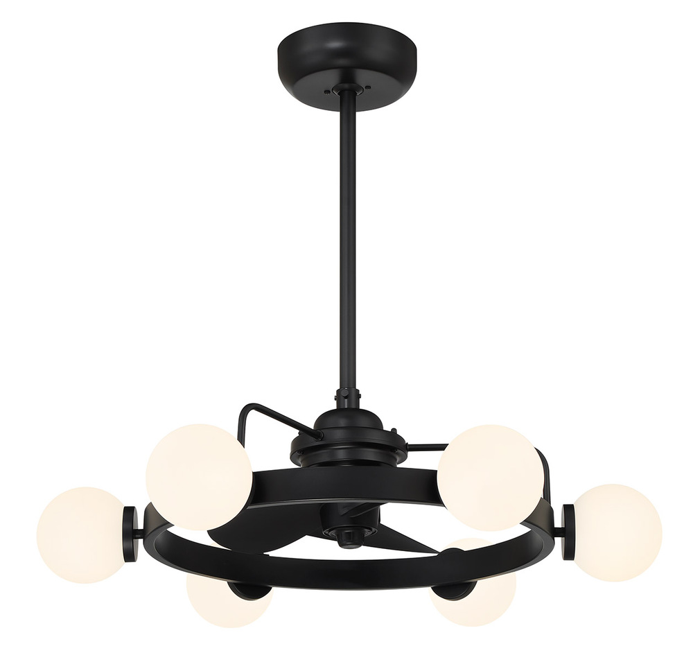 The ultra-cool Savoy House Gibson 6-light Fan D'Lier brings a touch of midcentury modern pop to any room with its globes of opal glass and its Matte Black finish. Integrated, dimmable LED light brings bright and useful light while the DC motor brings efficiency. A handheld remote control is included for extra convenience. Gibson is 30" in width and 10" in height. Comes with a 4" downrod and an 18" downrod. Fan D'Liers are a Savoy House exclusive that combines the best of ceiling fans with the best of chandeliers in one fabulously fashionable fixture. These custom designs are inspired by high-end designer styles and take top trends to a whole new level.
