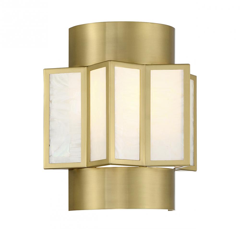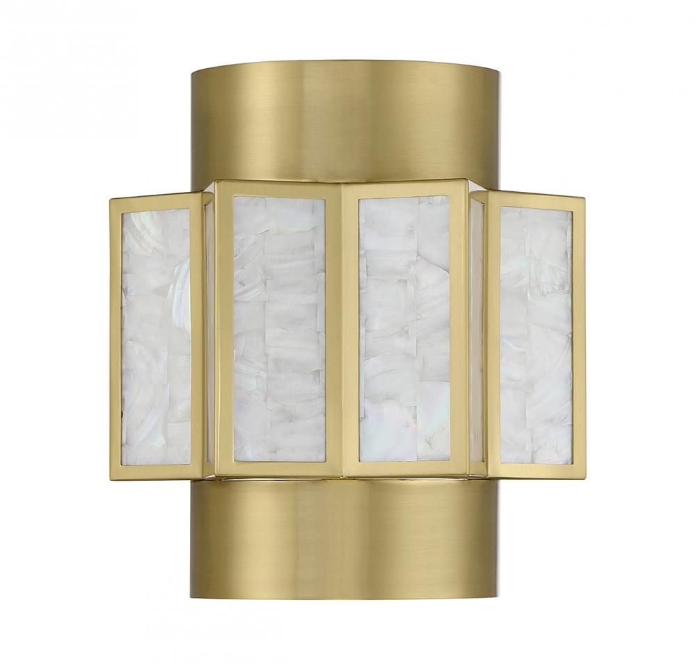 It is often said that lighting is the jewelry of the home and the Savoy House Gideon 2-light sconce is an excellent example of this saying. Pieces of natural capiz shell are arranged into a boldly geometric frame with a warm brass finish. When the light is off, the unique swirls and patterns on the shell will mesmerize. When the light is on, the shell will create a beautifully soft glow. Gideon is 11" in height, 10" in width and extends 4.5" from the wall. It uses 2 candelabra size bulbs of up to 60 watts per bulb (bulbs not included).