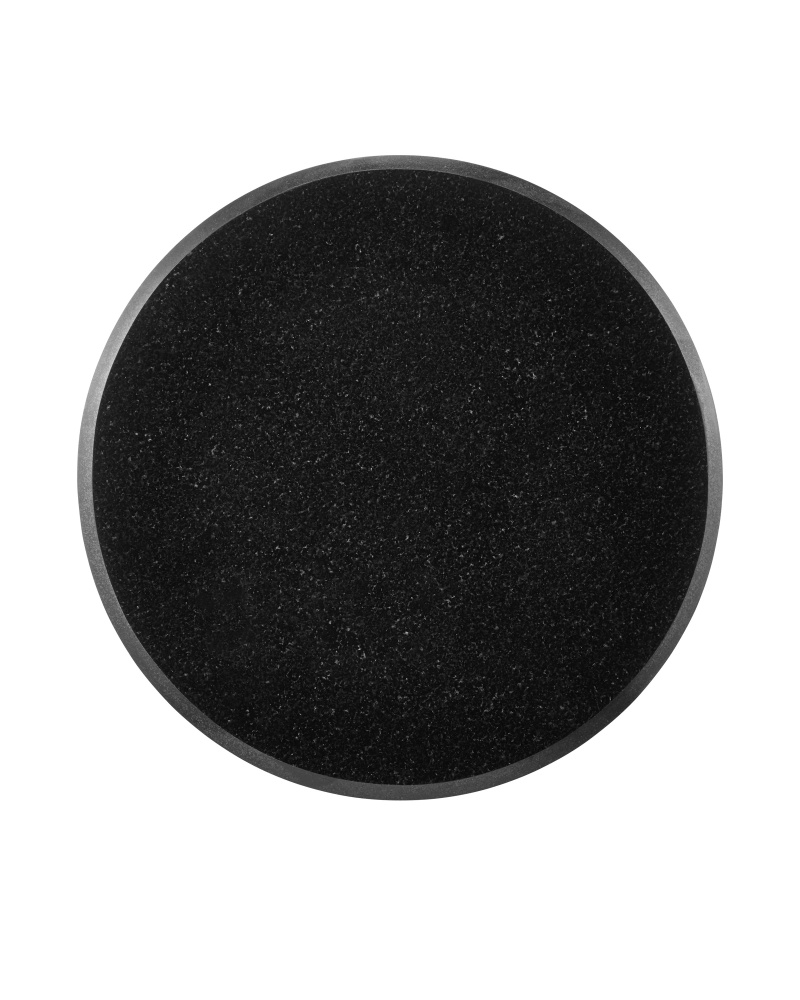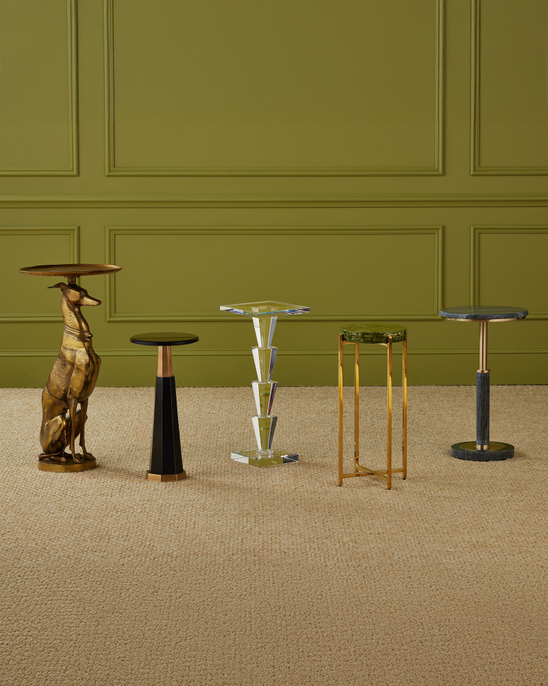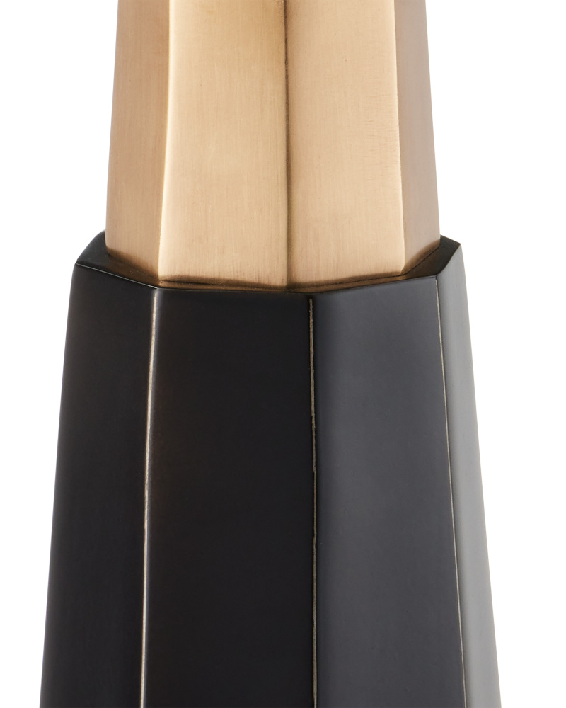 The Gieves Drinks Table has a round black granite disc for a tabletop that is supported by a telescoping pedestal crafted from metal that sits atop a fluted base. The top-most portion of the pedestal in an antique brass finish matches the base, while the black granite top matches the larger bottom portion of the flaring column in a bronze finish. The small table, that stands 21 inches high and is 10 inches in diameter, packs a stylistic punch for such a petite piece.