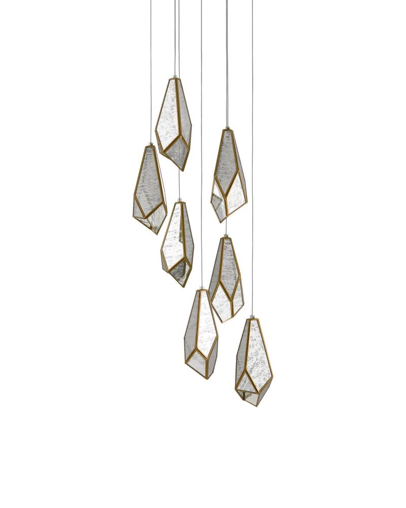 The faceted shades of the Glace 7-Light Multi-Drop Pendant are made of panes of Raj mirror joined with seams of metal in a brass finish. The organic shape of the shades and the fact they hang at differing heights brings this mirrored pendant added personality that will make it a piece of jewelry in a space. The canopy of this piece is luminous in a painted silver finish. This fixture is among Currey & Company's multi-drop pendant collection, which includes multiple configurations.