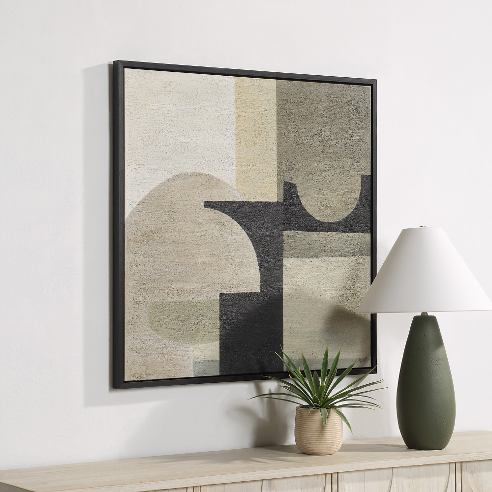 Characterized by a neutral palette and modern minimalism, the Gladiolus abstract art painting is poised to deliver a stylish impact to any space. Featuring a bold composition of shapes that are simultaneously geometric and organic, its shades of black and cream create a striking effect for all to admire. Hand painted using a sand gel textured technique, this continuous edge canvas has an art gallery look that’s emphasized by its black frame. Ready to hang in any modern home or office, all that’s left for you to do is choose the perfect wall to highlight its endless appeal.