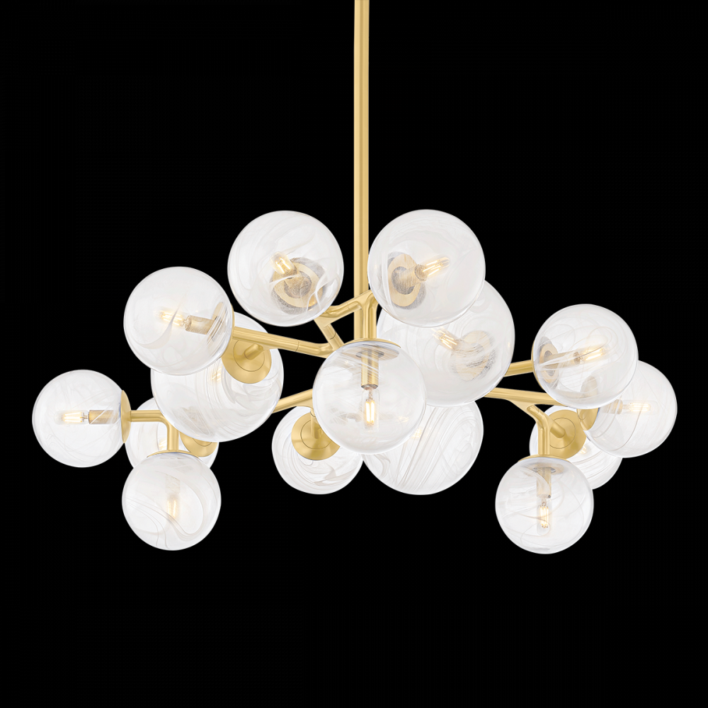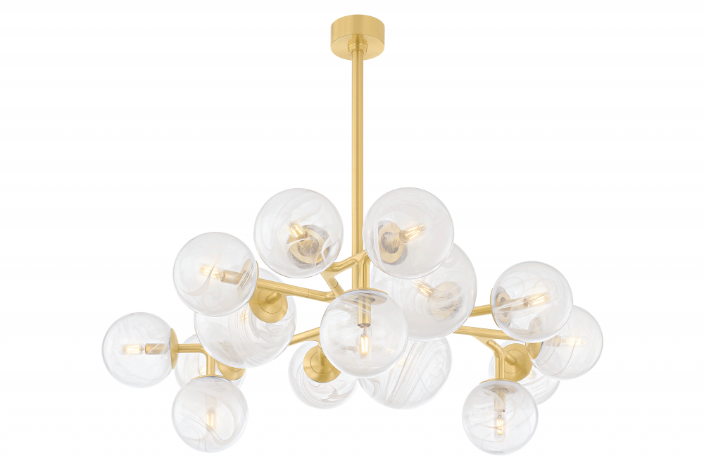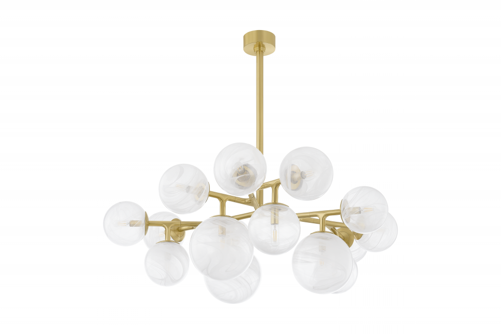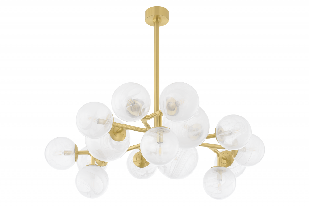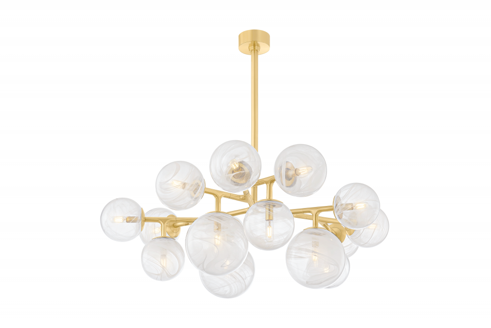 The Glasgow family of chandeliers and linears captures the old-meets-new vibrancy of its namesake Scottish city. Resembling celestial bodies in the night sky, the Remolino Blanco swirled glass globes are suspended from a branch-inspired Vintage Polished Brass frame. Choose from different formats to suit your space, from 8 to 24 lights.