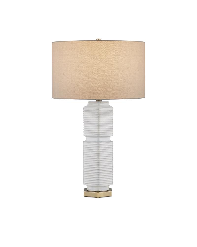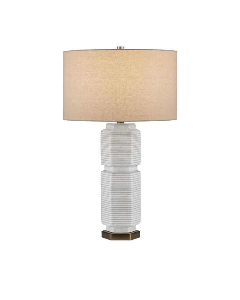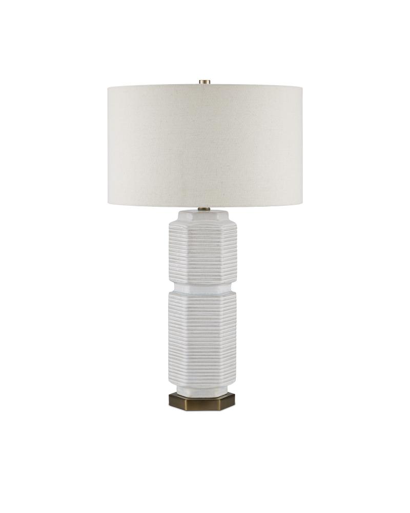 The Glebe Table Lamp has a hexagonal shape made of ceramic with a white glaze withvery subtle hints of beige and blue. The geometric complexity of this white lamp is heightened by the striated lines pressed into it and the indentions at the base, near its center, and as the body meets the hardware at the top. The base, hardware, and finial in an antique brass finish are warm elements to the design, as is the textural shade.