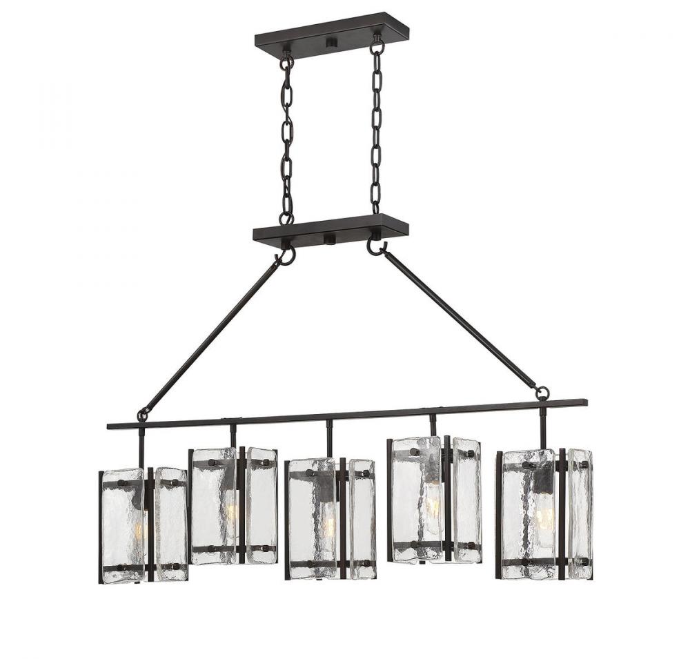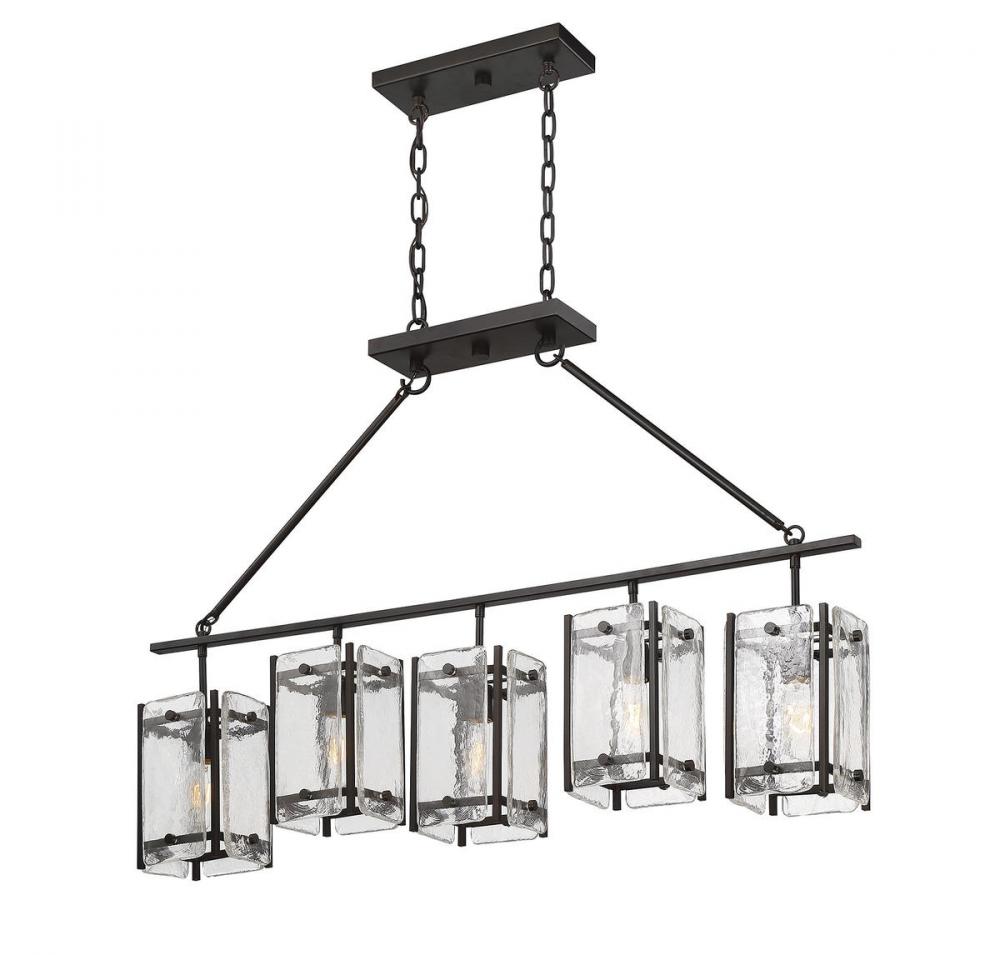 In the Savoy House Glenwood 5-light linear chandelier, strong geometric lines combine with gorgeous glass for a look you'll love every day. Designed by Brian Thomas, the straightforward framework of the Glenwood has a classic English bronze finish that blends well with other hardware in your home. A central bar holds five rectangular lanterns with metal grid frames and panes of Piastra glass, creating an artisan aesthetic. The five 60W standard size bulbs of this linear chandelier are hung at staggered heights along the 45.13” length. It's an ideal shape for your dining room, kitchen island, living room, breakfast area, family room, great room, game tables, media room, office or home bar.