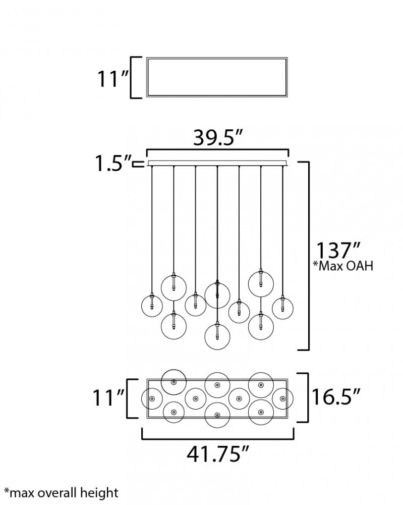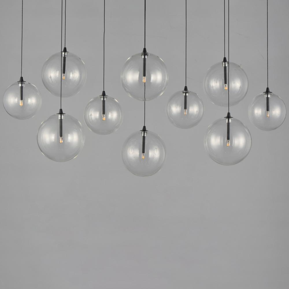 An airy configuration of Clear blown glass globe shades in various sizes suspend on thin low voltage wires. Thin tubes finished in Black or Gold descend into the center of the globes where a small G4 LED lamp provides a spark of light.