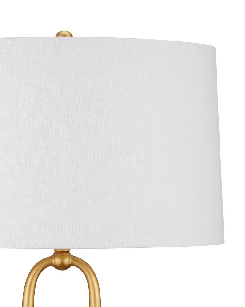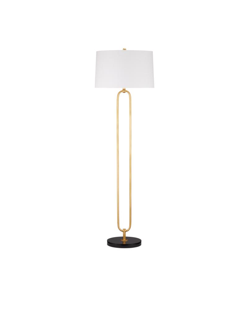 The oblong open-form body of the Glossary Floor Lamp is made of metal in a contemporary gold leaf finish. Designed to look like a giant paper clip that rises above a black marble base, this gold floor lamp is a perfect choice for a space needing stylish yet unobtrusive elements. The Glossary is topped with an off-white linen shade.