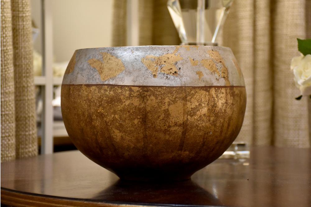 The Addie bowl has a diameter of 9" and grabs our customer's attentional at each market. The gold and silver leaf finish and the sculptured resin are the perfect design accessory.