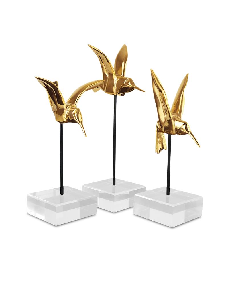 The Gold Hummingbirds Set of sculptures includes three playful figures that look like origami, though they are made of bronze in a gold polish finish to resemble folded paper forms. The way the sculptures are perched on black rods that affix them to acrylic bases furthers the impression they are hovering as real hummingbirds gracefully do. This set of gold sculptures captures the birds in different stages of flight.