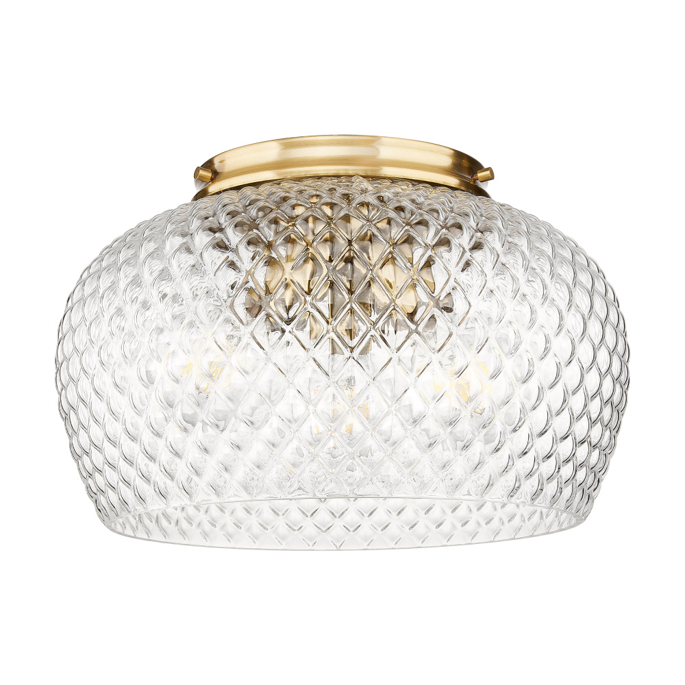 Brighten your space with the luxurious Modern Brushed Gold elegance of the Golden Lighting Adeline 3-light Flush Mount. This striking fixture features a glass shade that enhances its warm glow, creating an inviting atmosphere. The clear glass shade delivers unobstructed light, elevating the visual appeal of this timeless piece. With its polished and glossy finish, the glass complements the rich texture of the fixture, making it a centerpiece in any room. The Modern Brushed Gold finish radiates warmth, presenting a sophisticated sheen that diffuses light gracefully, ideal for a myriad of decor from vintage to modern. Designed for low ceilings in various spaces such as hallways, closets, or bathrooms, it is damp rated for areas exposed to occasional moisture. At dimensions of 14"W x 8.63"H x 14"D, this fixture requires three E26 medium base bulbs (not included), with a maximum wattage of 60 per bulb. Transform your home with this elegant lighting solution that merges quality and aesthetic appeal effortlessly.