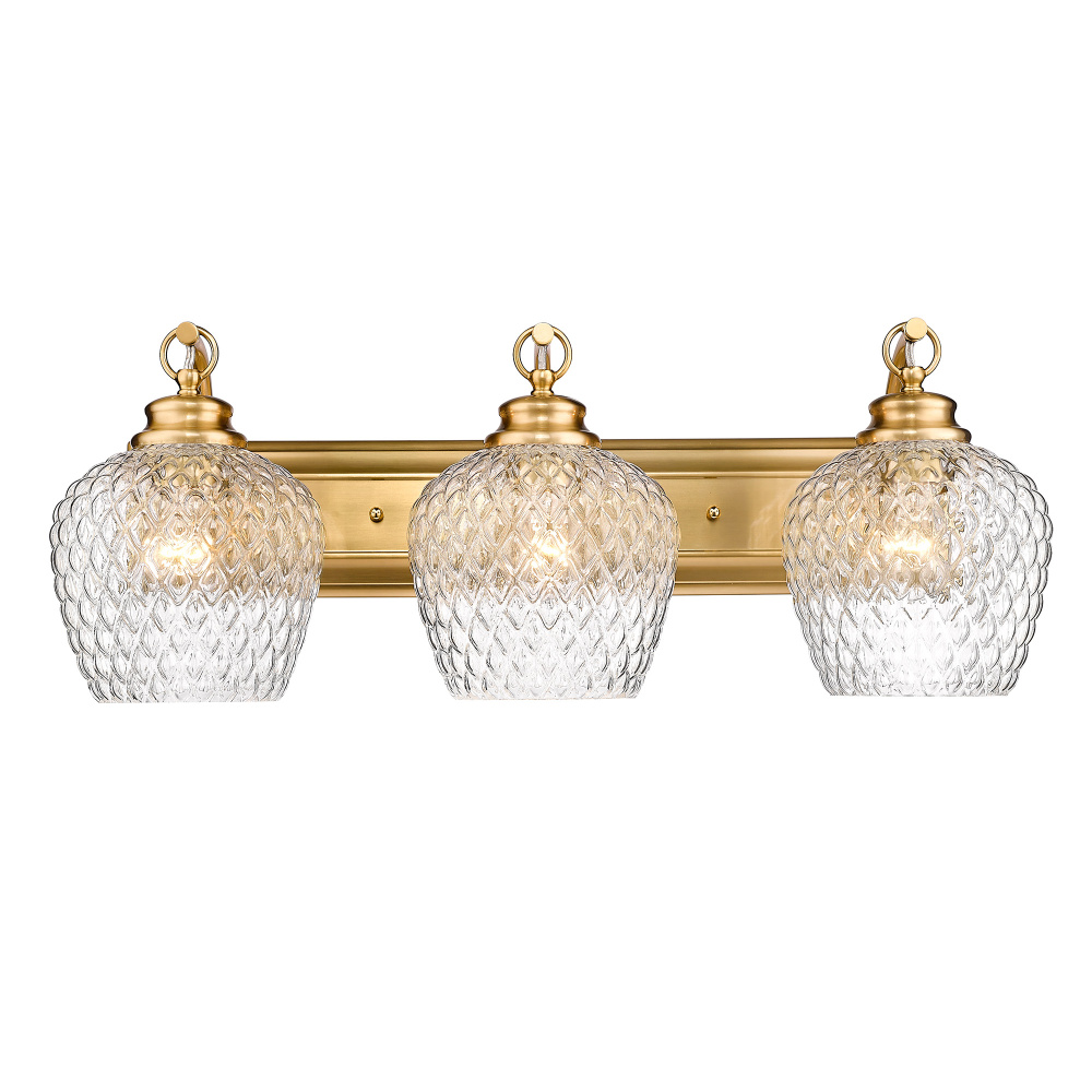 Bring traditional elegance into your home with the Golden Lighting Adeline 3-light Vanity. Featuring clear glass shades and a modern brushed gold frame, it creates a welcoming atmosphere. The clear glass shade offers brilliant, unobstructed light, allowing the beauty of the bulbs to take center stage. Its polished finish complements a wide array of styles, ensuring a timeless look in any bathroom. Our modern brushed gold finish exudes warmth and sophistication, perfectly enhancing your space’s aesthetic. This fixture is damp location rated, making it suitable for covered and semi-enclosed spaces like bathrooms and laundry rooms. Installation is straightforward, requiring three E26 Medium base bulbs (not included) with a maximum wattage of 100 per bulb. Overall Dimensions: 26.25"W x 10"H x 9.5"D. Elevate your home with charming farmhouse style and quality craftsmanship from Golden Lighting.