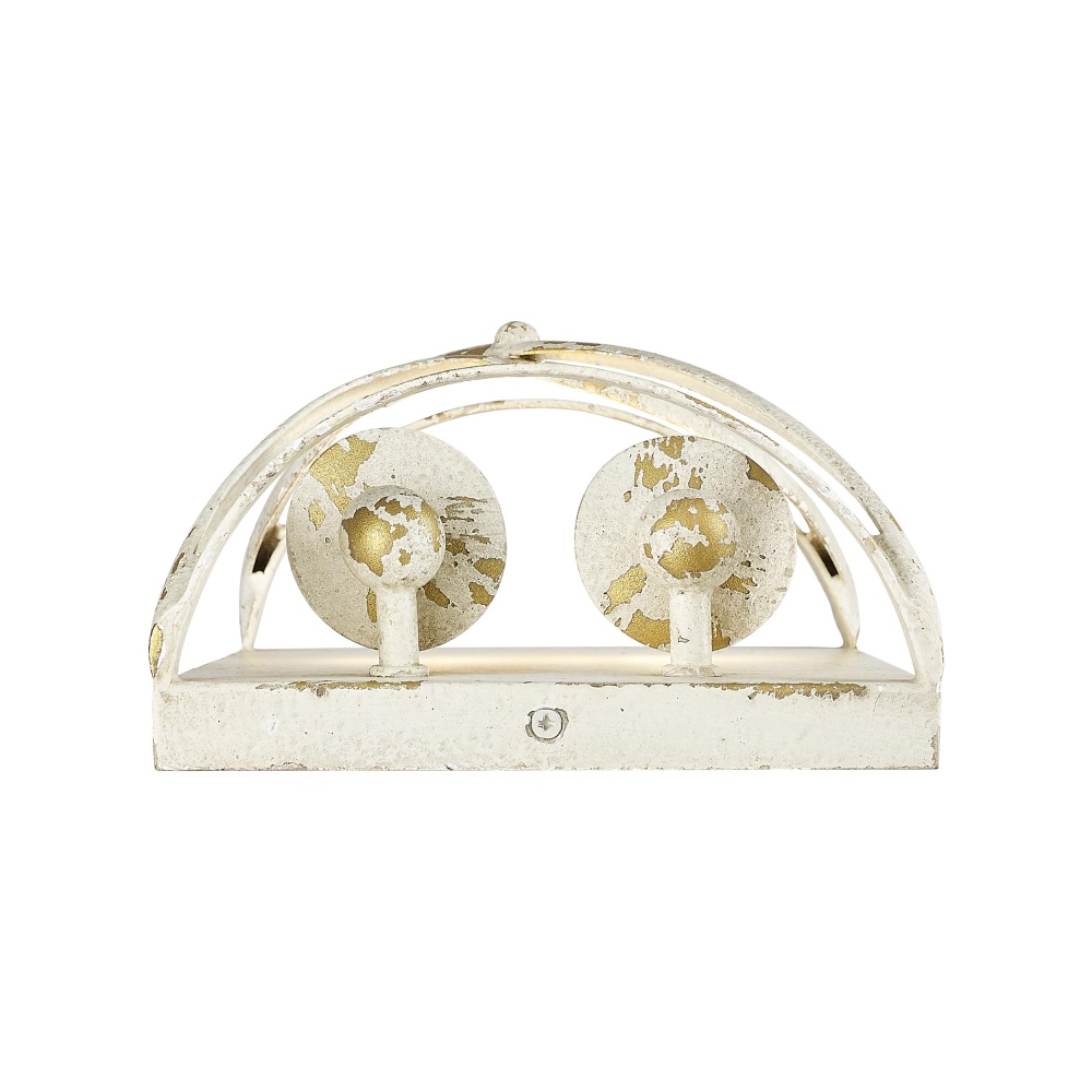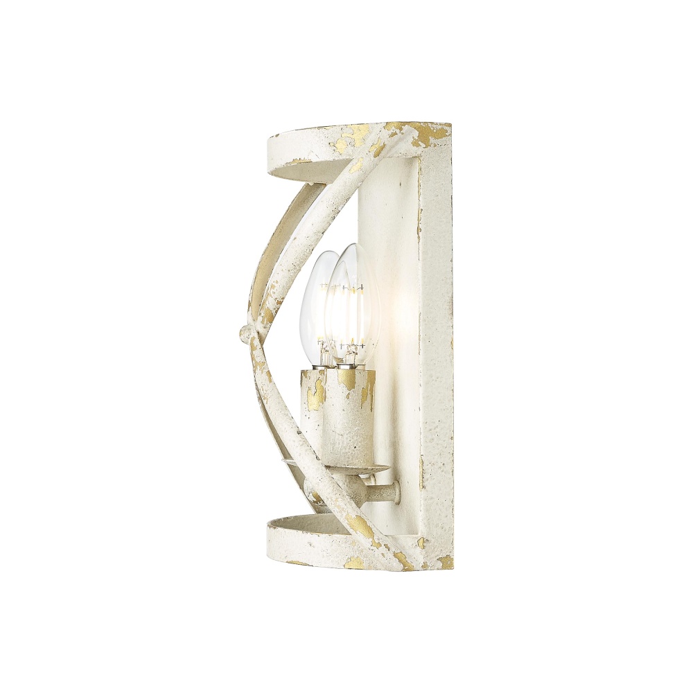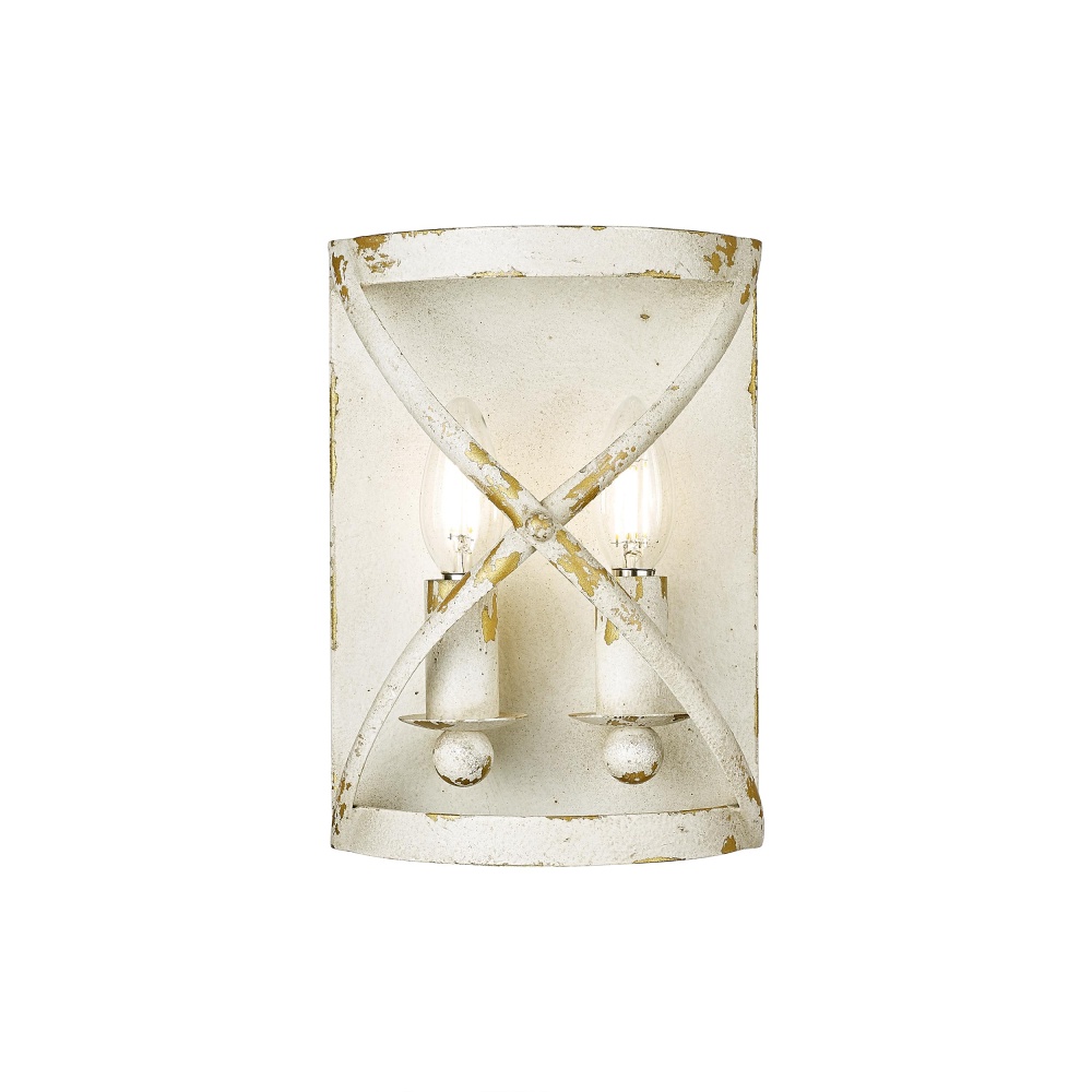 Bring rustic farmhouse charm into your home with the Golden Lighting Alcott 2-light Wall Sconce in Antique Ivory. Featuring a beautifully aged finish, it creates a welcoming atmosphere. With no shade present, the artisan finishes are directly showcased—a hand-painted, distressed antique ivory frame adorned with gold leafing captures the light beautifully, enhancing any decor with its unique character. Evoking a treasured European heirloom, the Antique Ivory finish is rich with character and history. Each piece reveals unexpected glints of a warm underlayer that expresses romance and storied elegance. This versatile wall sconce is damp location rated, suitable for covered and semi-enclosed spaces, making it perfect for hallways, bathrooms, and cozy dining rooms. Requires 2 E12 Candelabra base bulbs to illuminate your space (not included). Dimensions: Overall 7.13"W x 10"H x 4"D. Add a touch of classic charm to your interiors with this unique fixture, ideal for creating an inviting atmosphere.