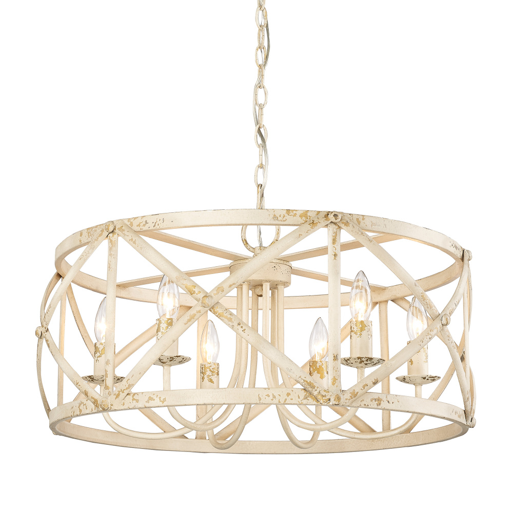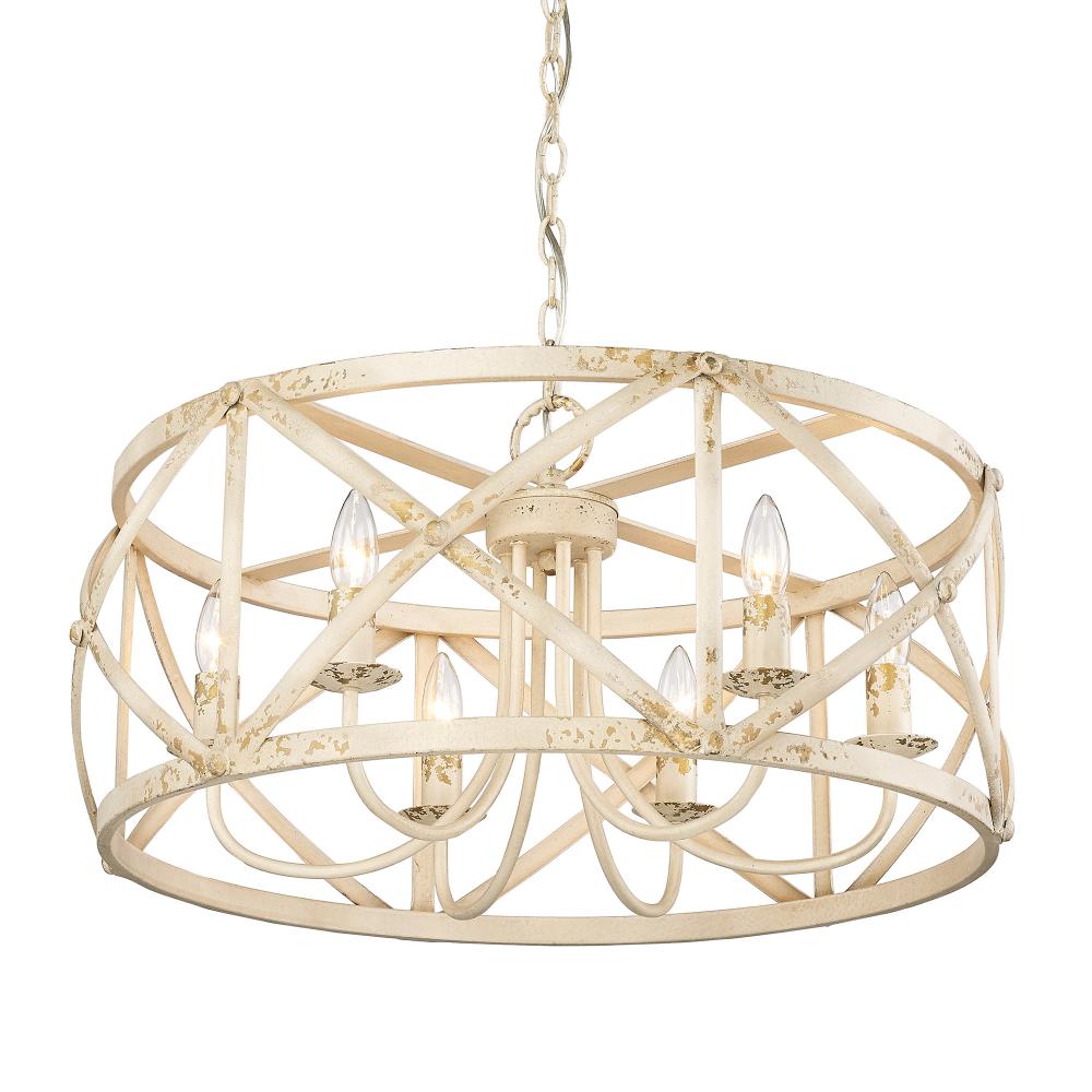 Bring classic elegance into your home with the Golden Lighting Alcott 6-light Chandelier. Featuring a metal shade and a captivating Antique Ivory frame, it creates a welcoming atmosphere. The metal shade complements the chandelier's exquisite structure, ensuring warm illumination throughout the space. The Antique Ivory finish evokes a sense of romance with its creamy base and sophisticated cracks, revealing gilded underlays that enhance its heirloom quality. Designed for dry locations, this chandelier is sloped-ceiling compatible and height-adjustable from 16.75" to 86.25", making it great for dining rooms, foyers, and living areas. Overall Dimensions: 26.13"W x 13.25"H x 26.13"D. Requires 6 E12 Candelabra base bulbs (not included), max 60 wattage per bulb. Upgrade your interior with this stunning chandelier that brings both light and character to your home.