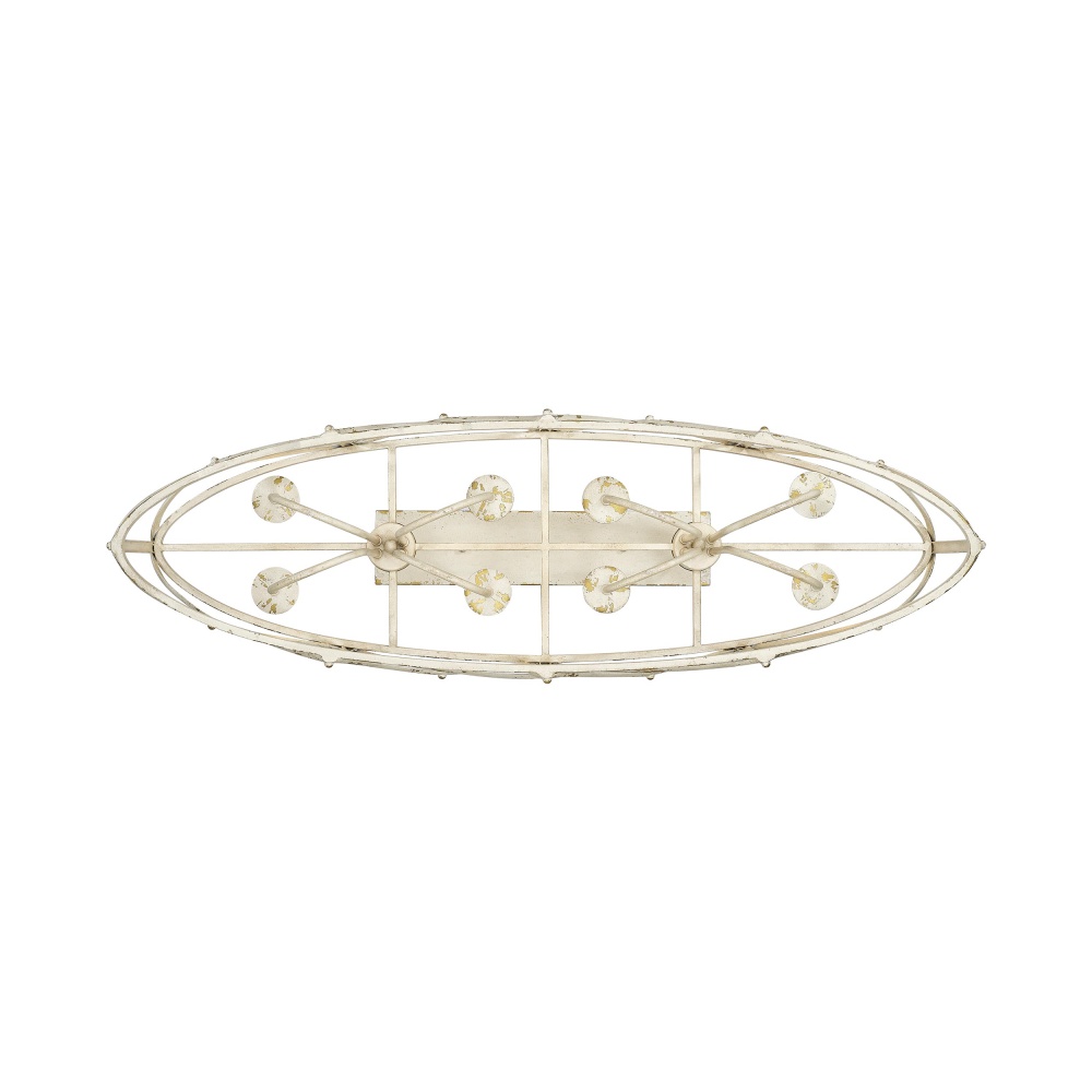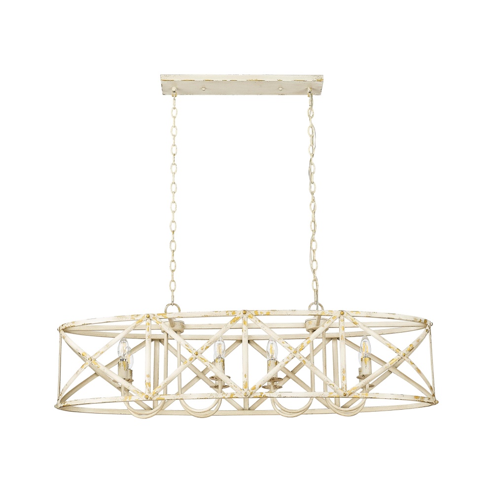 Bring traditional elegance into your home with the Golden Lighting Alcott 8-light Island Light. Featuring an open-cage design, it creates a welcoming atmosphere in your space. This fixture comes in a rich Antique Ivory finish that evokes the timeless charm of a treasured European heirloom. Each piece is carefully hand-painted, adorned with gold leafing, and highlights stunning craftsmanship. Ideal for dry locations like kitchens, dining areas, and hallways, the adjustable height (Min: 16.625"- Max: 90.25") and sloped-ceiling compatibility ensure it fits perfectly anywhere you desire. Overall Dimensions: 45"W x 13.63"H x 14"D. Requires 8 E12 Candelabra base bulbs (not included), with a max of 60 watts per bulb. Elevate your home with the inviting warmth and artisanal quality of this exquisite fixture.