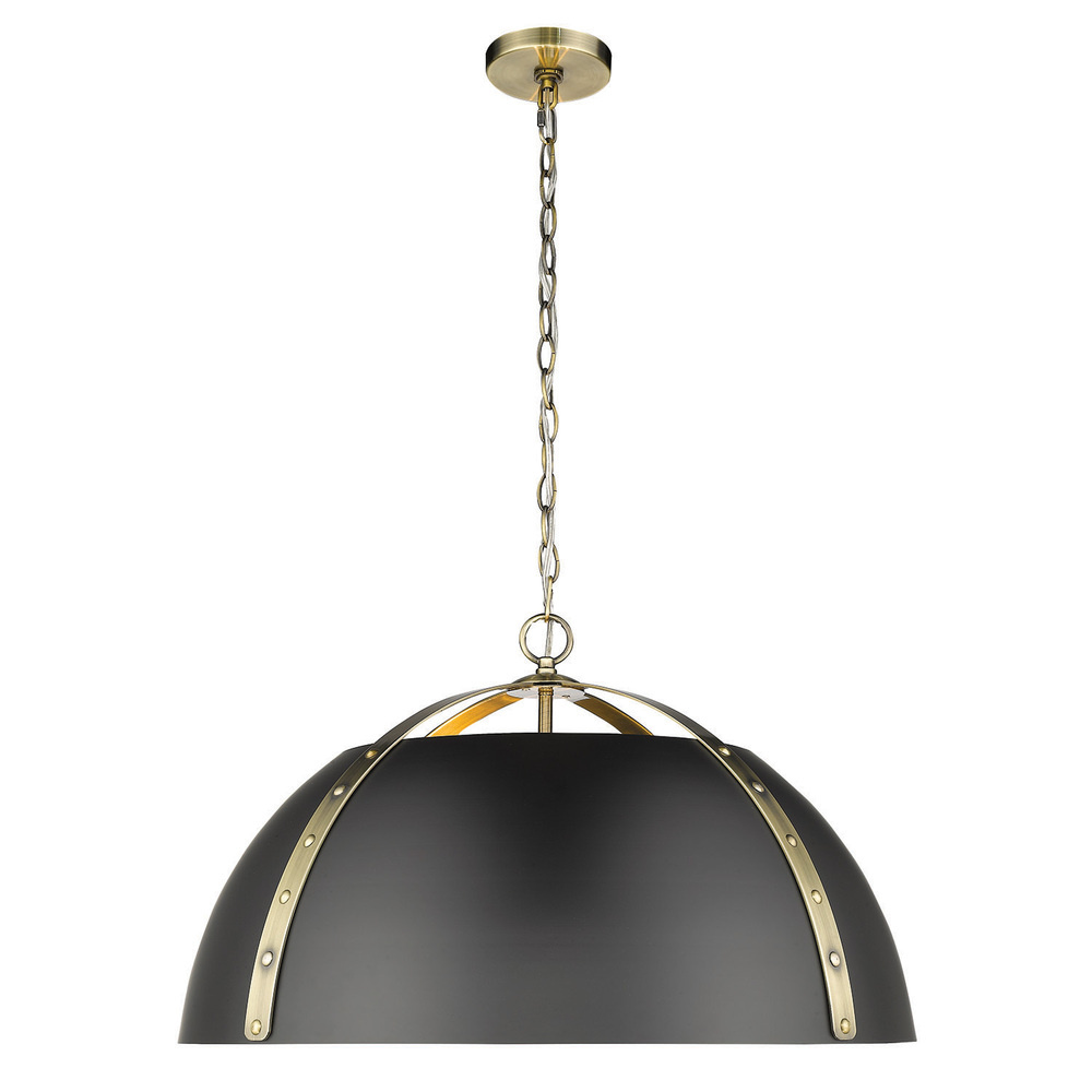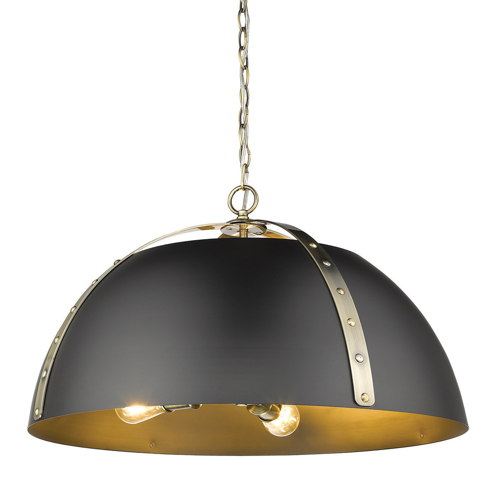 Bring modern elegance into your home with the Golden Lighting Aldrich 5-light Chandelier. Featuring a metal shade and an Aged Brass frame, it creates a welcoming atmosphere. This metal shade provides a dynamic light effect, emphasizing the sophisticated matte black finish. Enjoy a strong graphic quality and clean lines that enhance various decor styles. Embrace timeless décor with our Aged Brass finish, which radiates warmth reminiscent of vintage heirlooms. The fine brushed texture catches and diffuses light beautifully while adding a sense of history. Ideal for dining rooms and foyers, the fixture is Dry Location Rated, perfect for indoor spaces not subject to moisture. Its adjustable height (Min: 15.75"- Max: 87.75") and sloped-ceiling compatibility make installation easy and versatile. Overall Dimensions: 25"W x 15"H x 25"D. Requires 5 E26 medium-base bulbs (not included, Max 100 watt per bulb). Elevate your lighting design with quality and style from Golden Lighting.