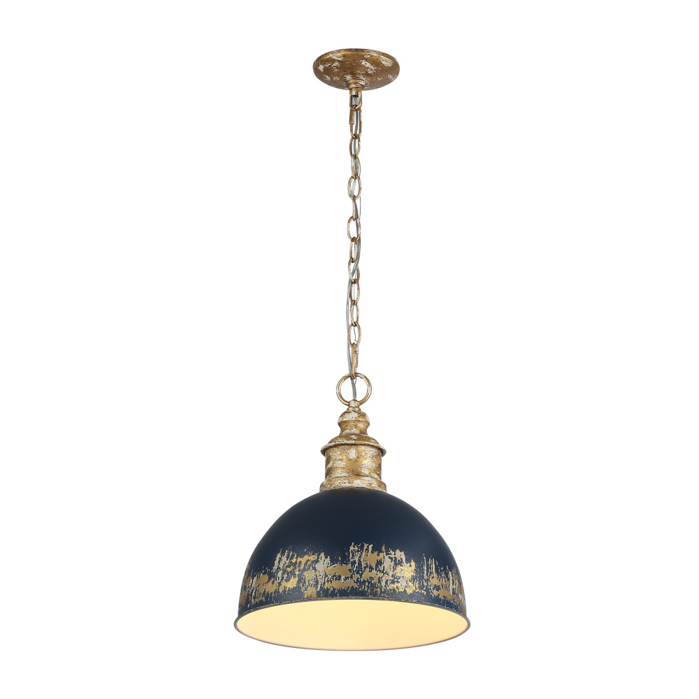 Bring traditional elegance into your home with the Golden Lighting Alison 1-light Pendant. Featuring a metal shade and a Vintage Gold frame, it creates a welcoming atmosphere. The metal shade showcases an Antique Matte Navy finish, creating a dramatic and opulent statement. The deep navy base contrasts beautifully with the distressed warm gold leaf application, evoking the richness of a midnight sky. Our Vintage Gold finish is an artisanal masterpiece that adds a unique character to each piece, perfect for those who appreciate handcrafted heirloom-quality design. Perfect for kitchens, dining rooms, or bedrooms, this pendant provides focused illumination while being ideal for entryways and bathrooms. It is Damp Location Rated for covered spaces with occasional moisture. Installation is easy, with adjustable height options ranging from 17.375" to 89.375". Overall dimensions are 12"W x 13.88"H x 12"D. This pendant requires one E26 Medium base bulb (not included), with a maximum wattage of 100. Elevate your home decor with this blend of rustic charm and luxurious appeal, creating a unique ambiance in any setting.