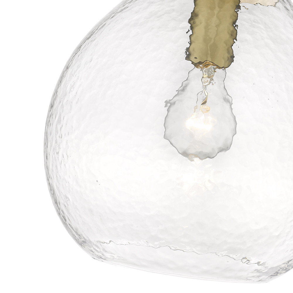 Bring transitional elegance into your home with the Golden Lighting Ariella 1-light Pendant in Brushed Champagne Brass. Featuring a glass shade, it creates a welcoming atmosphere. This stunning glass shade, made of Hammered Clear Glass, is distinguished by its dense, hammered texture and glossy finish, designed to create a sparkling, refractive light effect. It casts a brilliant, dappled sparkle onto surrounding surfaces, adding a rustic elegance and captivating visual texture to any space. The Brushed Champagne Brass finish offers a chic and versatile color that blends warmth with softness, perfect for adding a touch of quiet luxury to your interiors. Its refined texture beautifully catches the light and complements various decor styles. This pendant is ideal for kitchens, dining rooms, or bedrooms and is perfect for focused yet decorative illumination in entryways, foyers, and even bathrooms. It is damp location rated, making it suitable for covered and semi-enclosed spaces with occasional moisture. The fixture is sloped-ceiling compatible and features an adjustable height ranging from 16.875" to 88.875", allowing for easy installation in various settings. Overall dimensions are 9.88"W x 13.38"H x 9.88"D, and it requires 1 E26 Medium base bulb (not included) with a maximum wattage of 60. The Golden Lighting Ariella pendant is a quality piece that enhances your home with its blend of style, function, and aesthetic appeal.