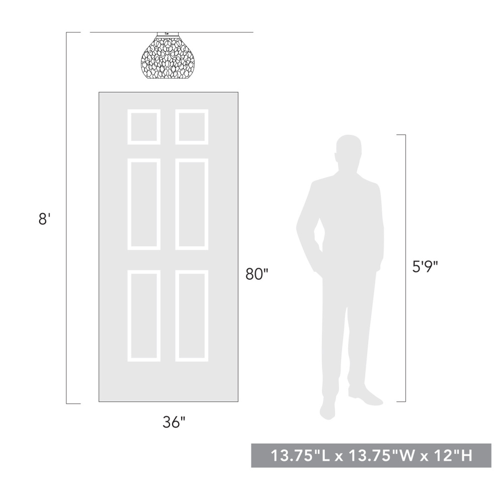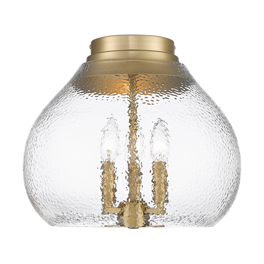 Step into modern elegance with the Golden Lighting Ariella 3-light Flush Mount. Featuring a glass shade and a brushed champagne brass frame, it creates an inviting atmosphere. The hammered clear glass shade is expertly textured, providing a sparkling, refractive light effect that enhances your space. Achieving a chic look, the brushed champagne brass finish offers a warm hue that blends beautifully with various aesthetics. This fixture is ideal for low ceilings in hallways, closets, or laundry areas — perfect for spaces with occasional moisture, as it is damp location rated. Dimensions: Overall 13.75"W x 12"H x 13.75"D. Requires 3 E12 Candelabra base bulbs (not included), max 60 wattage. Elevate your home with the quality and contemporary style of the Ariella series.