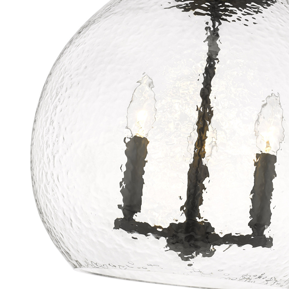 Bring Modern elegance into your home with the Golden Lighting Ariella 3-light Pendant in Matte Black. Featuring a glass shade, it creates a welcoming atmosphere. The Hammered Clear Glass shade delivers a stunning visual effect, skillfully textured to refract light beautifully. Finished in deep, non-reflective Matte Black, it offers a graphic quality that complements a broad range of decor. Identified for indoor spaces without moisture considerations, the fixture is adjustable in height and compatible with sloped ceilings, providing flexibility for your layout. Overall dimensions are 14.75"W x 20"H x 14.75"D, and it requires 3 E12 Candelabra base bulbs (not included, max 60 watts per bulb). Elevate your interiors with premium quality from Golden Lighting.