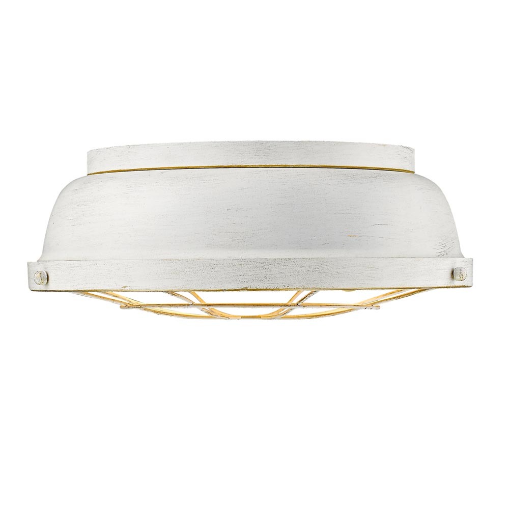 Bring timeless charm into your home with the Golden Lighting Bartlett 2-light Flush Mount. Featuring a metal shade and a French White frame, it creates a welcoming atmosphere. The metal shade beautifully diffuses light while contributing to the rustic aesthetic with its matte sheen. The finish is inspired by French country estates, hand-brushed for a deep, linear texture and a touch of warm gold undercoat that emerges through the white surface. Perfectly versatile, this fixture is ideal for low ceilings in hallways, closets, bathrooms, and more, and is rated for damp locations, making it suitable for covered spaces with occasional moisture. Overall Dimensions: 14"W x 5.5"H x 14"D. Requires 2 E26 Medium base bulbs (not included), with a maximum wattage of 60 per bulb. Enhance your home with this stylish piece that embodies quality craftsmanship and rustic charm.