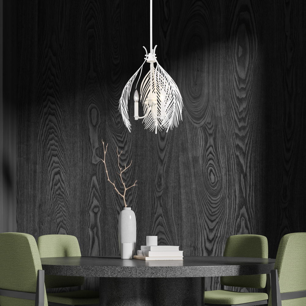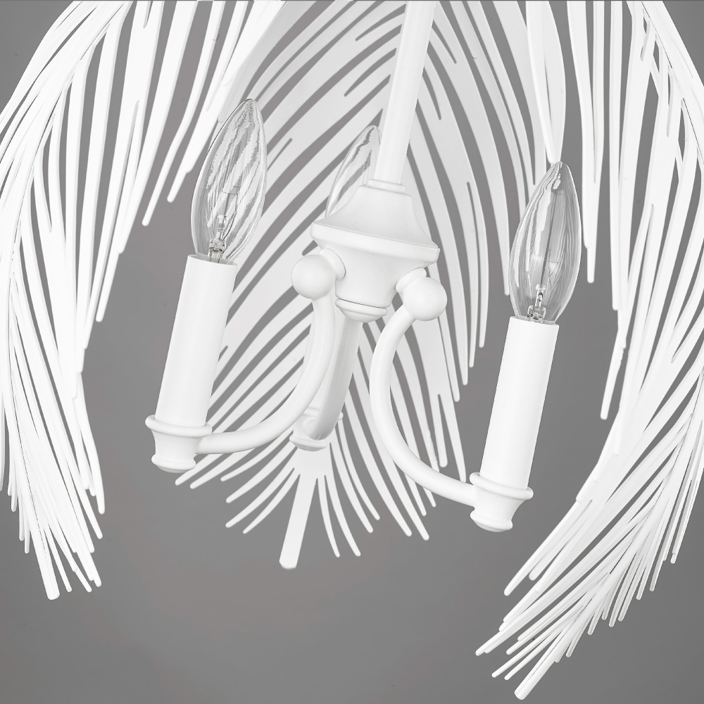 Bring nature-inspired elegance into your home with the Golden Lighting Cay 3-light Pendant. Featuring a metal shade and a clean matte white frame, it creates an inviting atmosphere. Its structure, free of obtrusive shades, showcases the feather motif's beauty, casting graceful illumination. The Matte White finish enhances the fixture’s clean lines and absorbs light beautifully for a minimalist charm. This fixture is ideal for kitchens, dining rooms, or bedrooms and is Dry Location Rated for indoor settings. The pendant is sloped-ceiling compatible and offers adjustable height for personalized settings. With dimensions of 14.38"W x 19"H x 14.38"D, it accommodates 3 E12 candelabra base bulbs (not included), with a maximum of 60 wattage per bulb. Embrace quality and elevate your home with this exquisitely designed pendant.