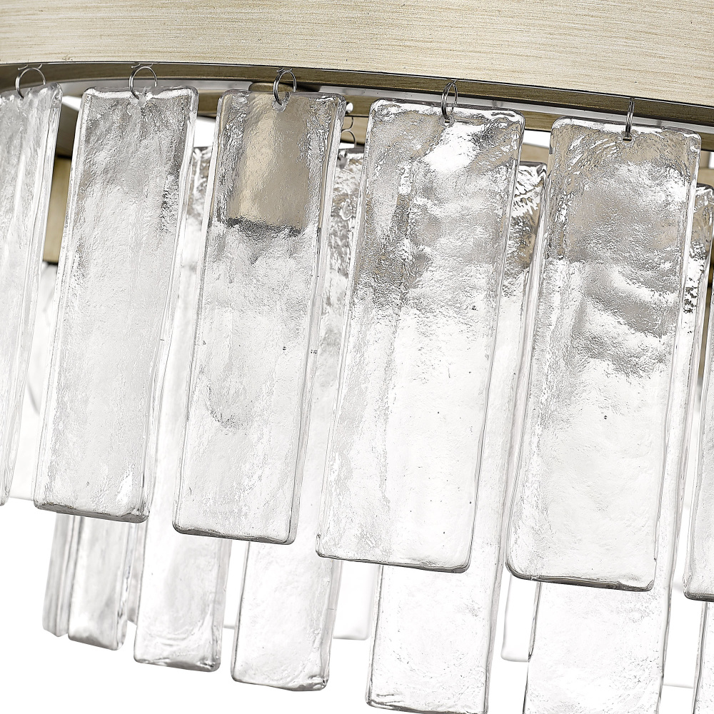 Bring Glam elegance into your home with the Golden Lighting Ciara 6-light Flush Mount in White Gold. Featuring a glass shade and a White Gold frame, it creates a welcoming atmosphere. The exquisite hammered water glass shade celebrates elemental beauty, providing a beautifully distorted light effect. Each piece captures the dynamic essence of water, meticulously crafted to create intricate patterns and glows. The artisanal finish offers a unique blend of warmth and coolness, adding character to your space. Ideal for low ceilings and designed for damp locations, this fixture can be easily installed as a semi-flush mount or pendant with adjustable height. Overall dimensions are 42"W x 10.88"H x 10"D, requiring 6 E26 medium base bulbs (not included) with a maximum wattage of 60 per bulb. Elevate your home with the luxurious ambiance and quality craftsmanship that the Ciara collection offers.
