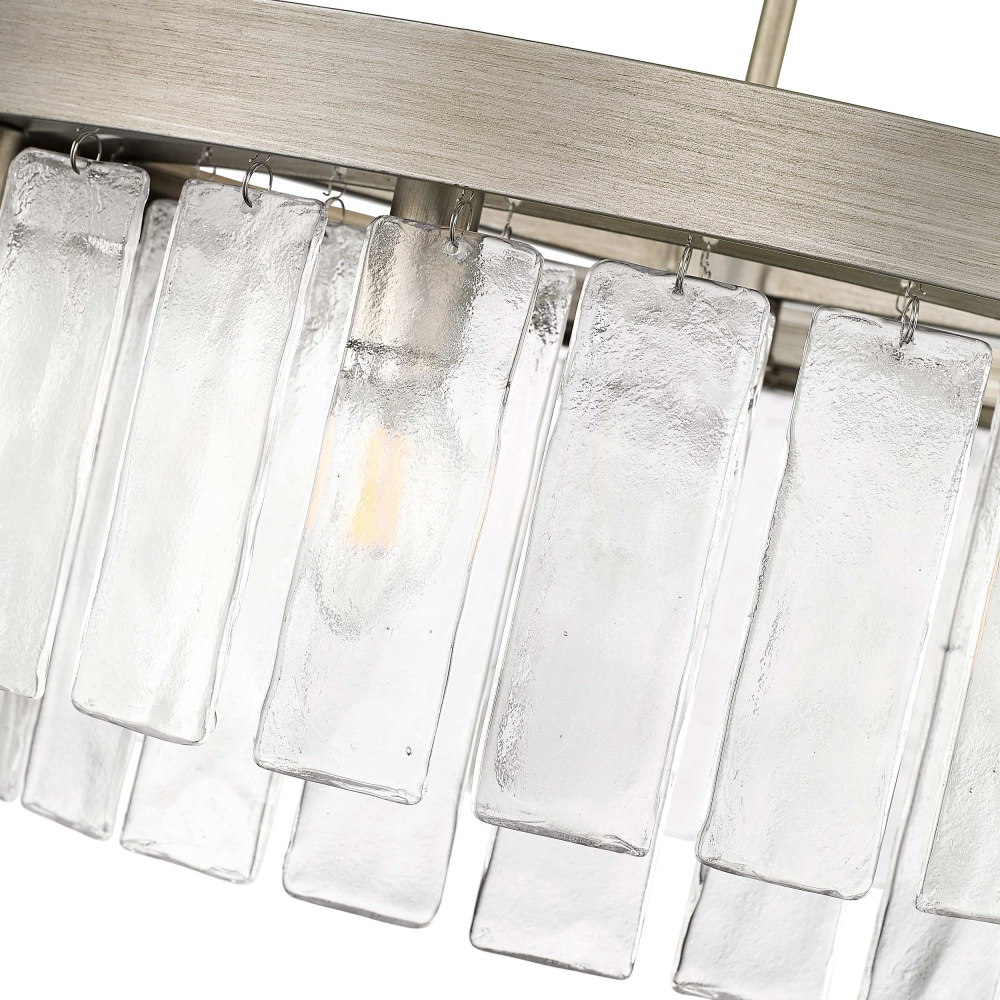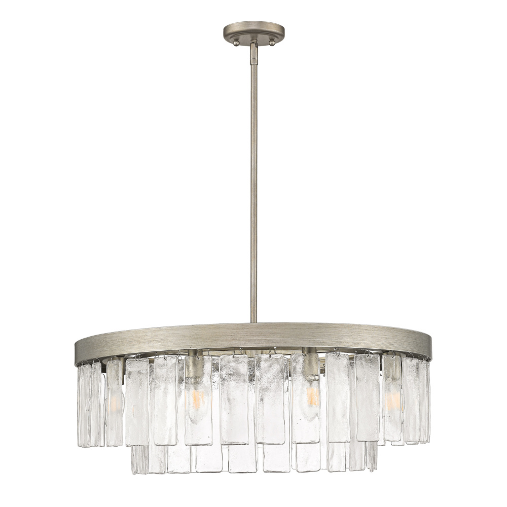 Bring glam elegance into your home with the Golden Lighting Ciara 9-light Chandelier. Featuring a glass shade and a Peruvian Silver frame, it creates a welcoming atmosphere. The glass shade employs a Hammered Water Glass, offering a distinct surface texture that artfully distorts and refracts light, making each moment uniquely illuminated. With elements reminiscent of frozen streams, it adds a touch of organic beauty and radiance to your setting. The Peruvian Silver finish captures a rustic elegance with its weathered tones and artisanal feel, perfect for complementing your home decor with a sophisticated touch. Ideal for dining rooms and foyers, this chandelier is Damp Location Rated, making it suitable for covered or semi-enclosed spaces. Its Convertible Design allows for flexible installation as either a semi-flush mount or pendant, with an Adjustable Height of 10.125" to 55". Overall Dimensions: 27"W x 10.13"H x 27"D. Requires 9 E12 Candelabra base bulbs (not included) with a maximum of 60 watts per bulb. Elevate your interior with a statement fixture that seamlessly blends artistry and elegance, designed to enhance your living spaces.