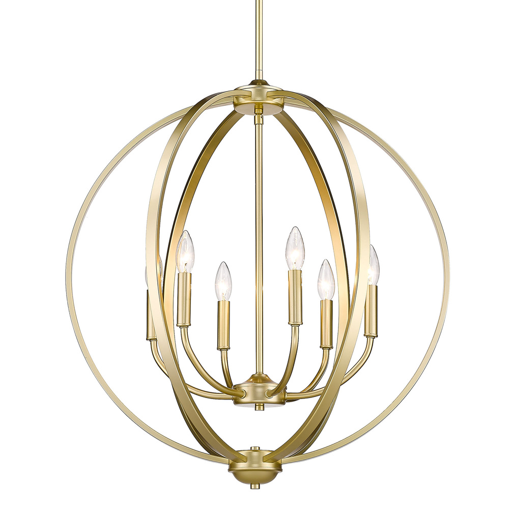 Bring refined elegance into your home with the Golden Lighting Colson 6-light Chandelier in Olympic Gold. Featuring a no shade design, it creates a welcoming atmosphere that enhances your decor. The classic candelabra style shines through without any shade, allowing light to distribute beautifully across the room while maintaining an understated elegance. With a soft, pale gold finish in a chalky matte texture, this chandelier adds warmth and sophistication to various interior styles. It is rated for dry locations, making it ideal for indoor spaces such as dining rooms, bedrooms, and hallways, with an adjustable height ranging from 31.375" to 73.375" for custom fit. Overall Dimensions: 26"W x 28.75"H x 26"D. Requires 6 E12 Candelabra base bulbs (not included), with a maximum wattage of 60 per bulb. Elevate your interiors with the quality and charm of this distinguished chandelier.
