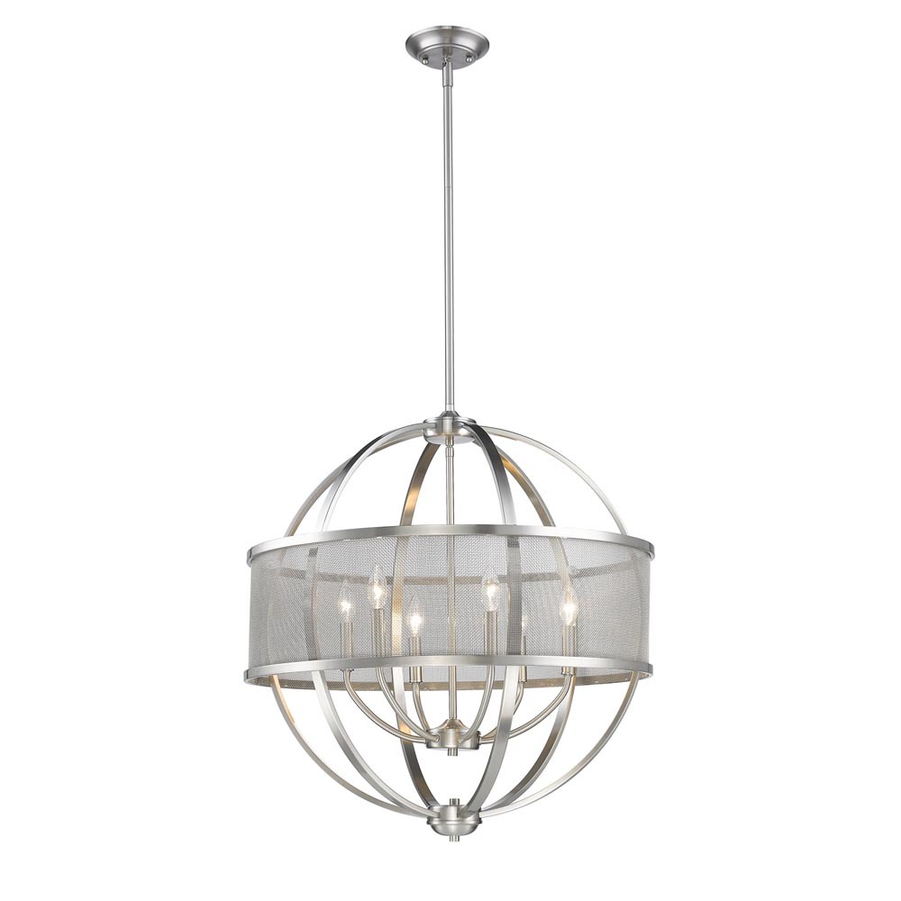 Bring Transitional elegance into your home with the Golden Lighting Colson 6-light Chandelier. Featuring a metal shade and a Pewter frame, it creates a welcoming atmosphere. The Pewter metal shade enhances the overall design by diffusing light softly, creating an elegant glow that is ideal for both modern and traditional interiors. The rich texture of the shade adds depth and sophistication. Our Pewter finish offers a soft, classic alternative to brighter silver tones, characterized by its medium-grey hue and subtle warmth, beautifully crafted for longevity. This chandelier is Dry Location Rated, perfect for indoor spaces like dining rooms or living areas. It is adjustable in height and sloped-ceiling compatible, allowing for versatile installation options. Overall dimensions are 26"W x 28.75"H x 26"D, requiring six E12 Candelabra base bulbs (not included), with a maximum wattage of 60 each. Create a striking statement in your home with the premium quality and timeless design of Golden Lighting.