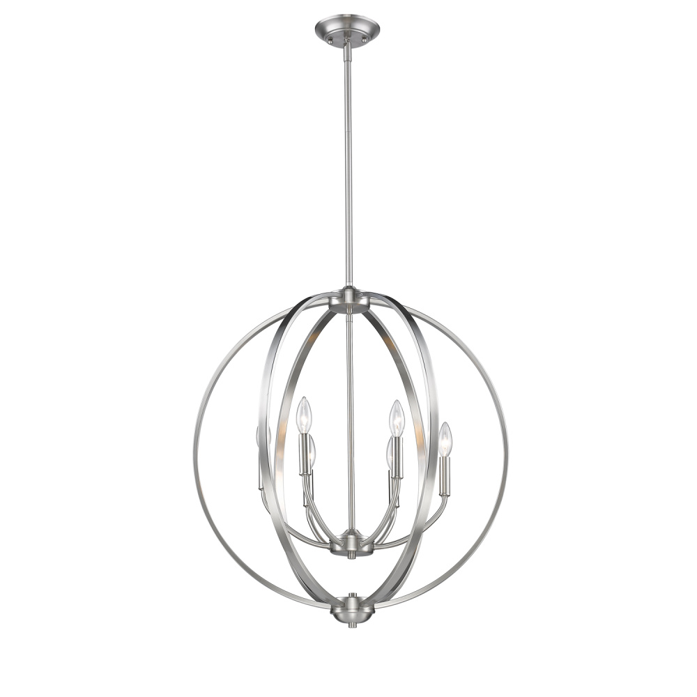 Bring Transitional elegance into your home with the Golden Lighting Colson 6-light Chandelier. With a Pewter finish, it creates a welcoming atmosphere. This chandelier features no shade, allowing the beauty of its intricate candelabra design to shine through. Ideal for creating a soft, elegant ambience, it works wonderfully in both classic and contemporary spaces. Our Pewter finish provides a versatile and sophisticated appeal with its medium-grey hue and subtle warmth, crafted through a durable electroplating process that casts a beautiful, non-glare glow. This fixture is Dry Location Rated, making it perfect for indoor applications like dining rooms and living spaces. It is also designed to be sloped-ceiling compatible and features an adjustable height, allowing customization for various settings. Overall dimensions are 26"W x 28.75"H x 26"D, requiring six E12 Candelabra base bulbs (not included), each with a maximum wattage of 60. Enhance your home with the refined beauty and exceptional craftsmanship of Golden Lighting.