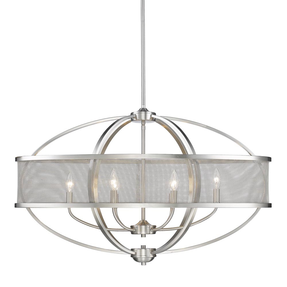 Bring Transitional elegance into your home with the Golden Lighting Colson 6-light Island Light in Pewter. Featuring a metal shade and a pewter frame, it creates a welcoming atmosphere. The clean lines of this metal shade bring a warm glow, ensuring your space feels bright and inviting. The pewter finish offers a soft and classic alternative to brighter silver tones. With its medium-grey hue and subtle warmth, this finish has an understated and timeless appeal. Tailored for kitchen islands, this island light is Dry Location Rated, ideal for indoor spaces not subject to moisture. It's also Sloped-Ceiling Compatible and has an Adjustable Height of 25.875" to 67.875", allowing easy customization for your needs. Dimensions: Overall Dimensions are 35"W x 23.25"H x 13"D. Requires 6 E12 Candelabra base bulbs (not included) with a maximum wattage of 60 per bulb. Elevate your space with the sophisticated quality of Golden Lighting's designs.
