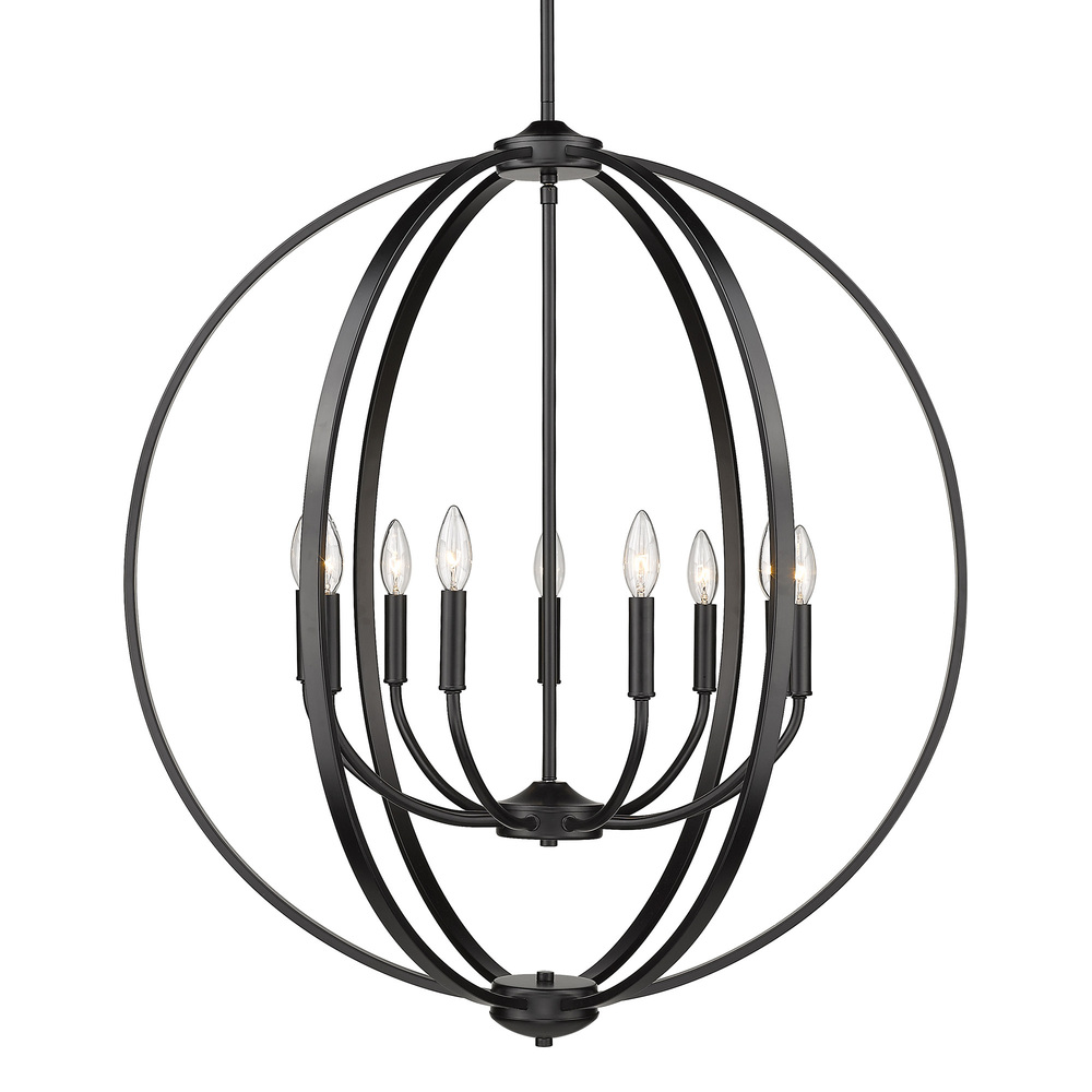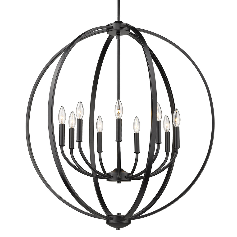 Elevate your space with the Golden Lighting Colson 9-light Chandelier. Featuring a Matte Black finish, it creates a welcoming atmosphere that exudes modern elegance in every corner of your home. With no shade, the open design allows for uninterrupted light flow, making this chandelier perfect for illuminating larger areas with a warm glow. The Matte Black finish is not only timeless but also incredibly versatile, effortlessly complementing both minimalist and contemporary decor styles. Ideal for dry locations like dining rooms, living rooms, or hallways, this chandelier is also sloped-ceiling compatible and boasts an adjustable height from 37.375" to 79.375". Overall Dimensions: 31.25"W x 34.75"H x 31.25"D. Requires 9 E12 candelabra base bulbs (not included), max 60 wattage per bulb. Transform your home with this stunning piece that balances quality and style seamlessly.