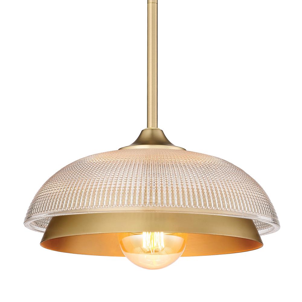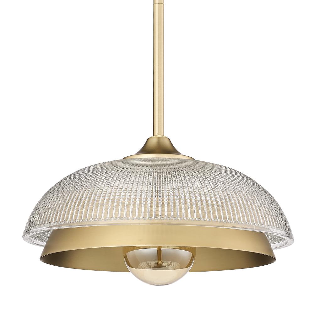 Bring timeless elegance into your home with the Golden Lighting Crawford 1-light Pendant. Featuring a glass shade and a Brushed Champagne Brass frame, it creates a welcoming atmosphere. The Retro Prism glass shade features a grid-like prismatic texture designed to create a brilliant, refractive light effect. This high-quality glass transforms illumination into a vibrant display, adding retro glamour to any space. With its stunning Brushed Champagne Brass finish, this pendant light offers an understated and elegant glow. It's perfect for adding a touch of quiet luxury to your interiors. Ideal for kitchens, dining rooms, and entryways, this fixture is Damp Location Rated and suitable for semi-enclosed spaces. The sloped-ceiling compatibility allows for effortless installation, and the adjustable height ranges from 15" to 51". Overall Dimensions: 11.75"W x 9"H x 11.75"D. Requires 1 E26 Medium base bulb (not included), with a maximum wattage of 100. Close your eyes and envision this captivating light transforming your space into a haven of sophistication and style, showcasing quality craftsmanship and artistic design.