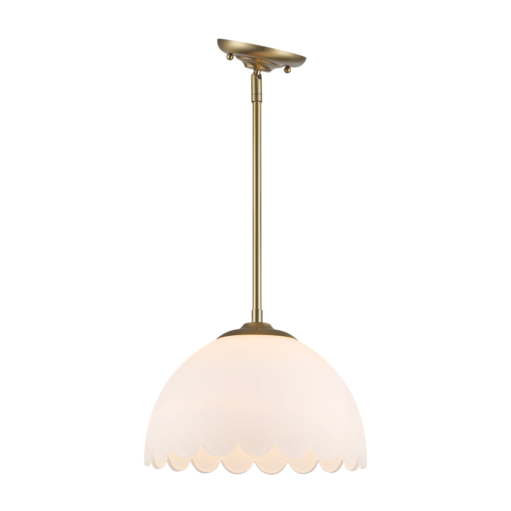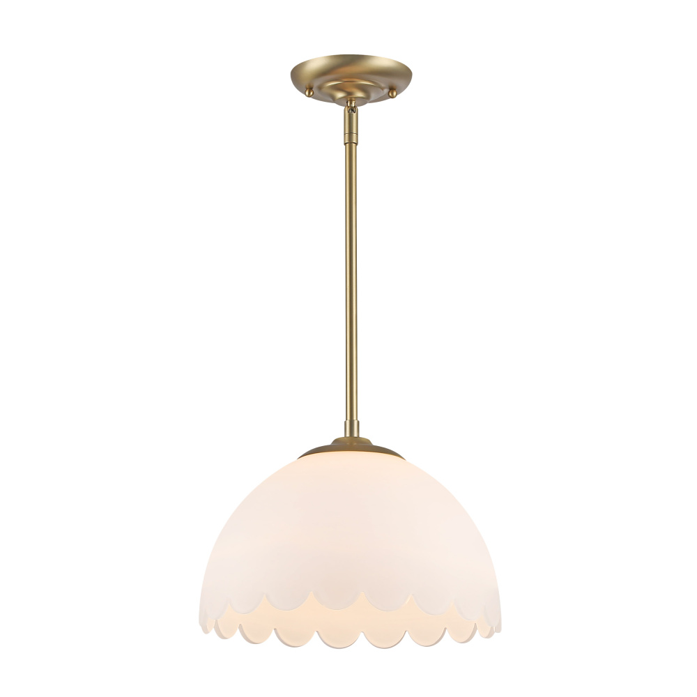 Bring transitional elegance into your home with the Golden Lighting Dorinda 1-light Pendant. Featuring a glass shade and a brushed champagne brass frame, it creates a welcoming atmosphere. The opal glass shade features a milky, translucent white color with a smooth, satin-matte finish, designed to diffuse light evenly for a soft, glare-free glow. This timeless and elegant piece beautifully illuminates your space while adding understated sophistication. The brushed champagne brass finish is the epitome of modern sophistication, skillfully blending warmth with a soft sheen to create a chic and versatile color. Perfect for adding a touch of quiet luxury to any interior. Perfect for entryways, foyers, kitchens, dining rooms, or even bathrooms, where focused yet decorative illumination is desired. This pendant is damp location rated, making it suitable for covered and semi-enclosed spaces. It is also sloped-ceiling compatible and features an adjustable height (min: 53.875" - max: 8.75"). Overall dimensions are 12.25"W x 8.75"H x 12.25"D, and it requires one E26 medium base bulb (not included), with a maximum wattage of 100. Elevate your home's ambiance with this stylish, crisp accent piece that embodies both quality and design.
