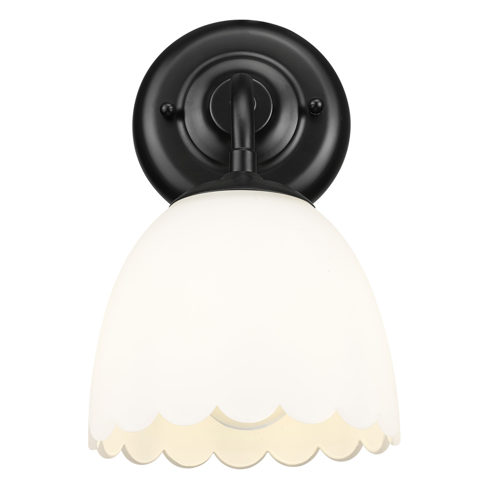 Bring modern sophistication into your home with the Golden Lighting Dorinda 1-light Wall Sconce. Featuring a glass shade and a Matte Black frame, it creates a welcoming atmosphere. The opal glass shade diffuses light evenly for a soft, glare-free glow, adding a beautiful ambiance that feels both vintage and contemporary. The Matte Black finish is timeless and versatile, offering a smooth, non-reflective surface that enhances any decor style, from minimalist to industrial. Perfect for illuminating hallways, stairways, or providing cozy ambiance in bedrooms and dining rooms, this fixture is damp location rated for use in areas with occasional moisture. Overall Dimensions: 6.5"W x 11"H x 7.5"D, requiring 1 E26 medium base bulb (not included), max 100 watts. Elevate your decor with this stylish and quality lighting option.