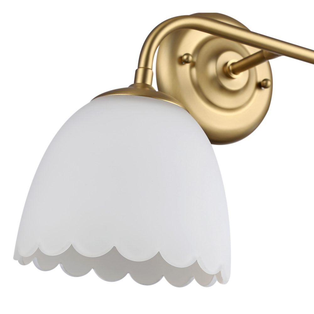 Bring a touch of luxury into your bathroom with the Golden Lighting Dorinda 2-light Vanity. Featuring two glass shades and a Brushed Champagne Brass frame, it delivers a welcoming atmosphere. The opal glass shades are designed to diffuse light evenly, creating a beautiful, glare-free glow that flatters any space. With its elegant Brushed Champagne Brass finish, this vanity light exudes sophistication, seamlessly blending the warmth of brass with a soft sheen to enhance contemporary interiors. Ideal for providing task lighting in bathrooms, this fixture is damp location rated, making it suitable for areas with occasional moisture. Overall Dimensions: 16.25"W x 11"H x 7.5"D, and it requires 2 E26 medium base bulbs (not included), max 100 watts per bulb. Elevate your bathroom experience with this stylish and functional vanity light fixture.