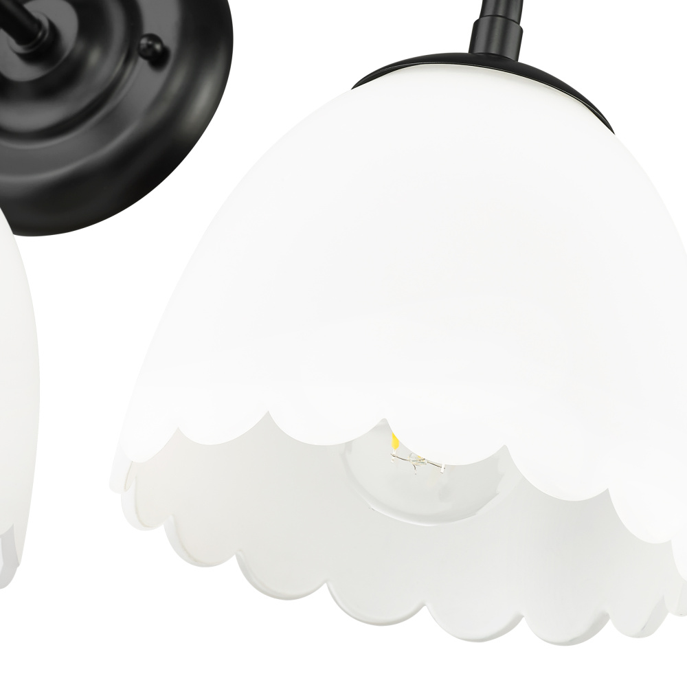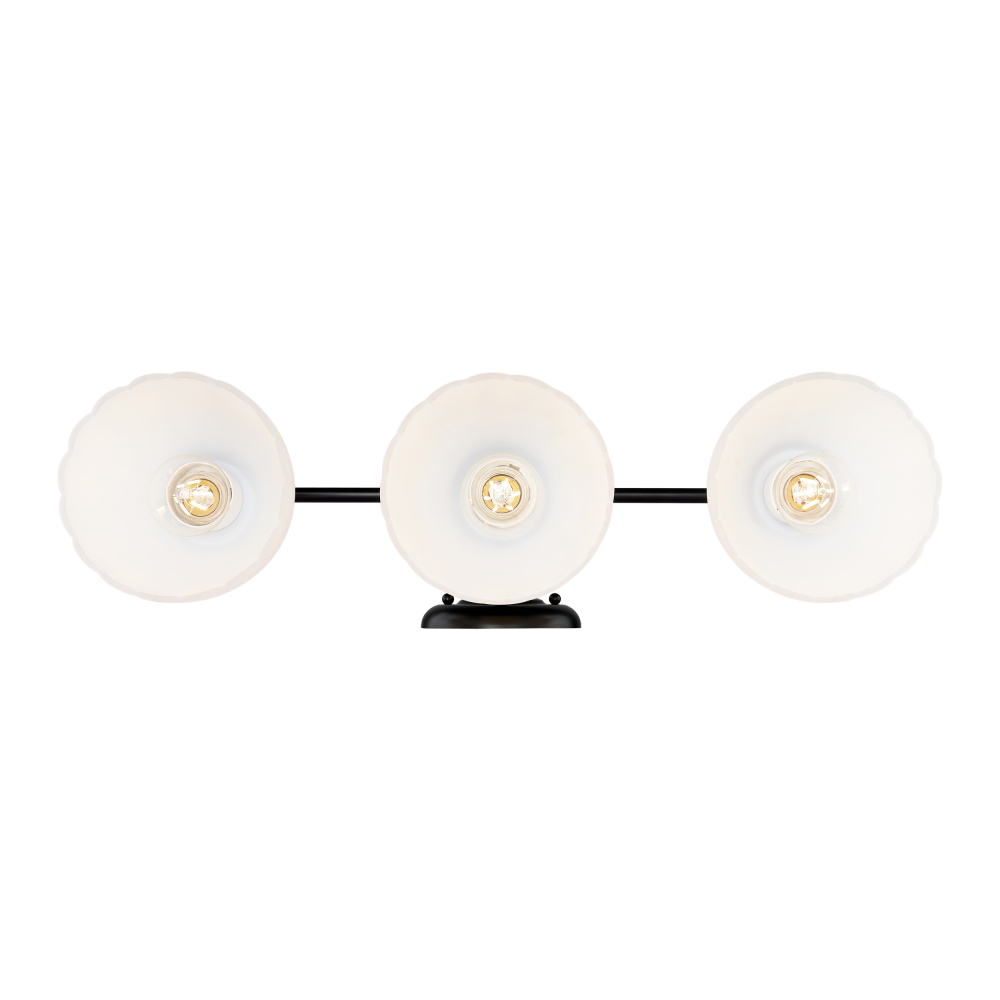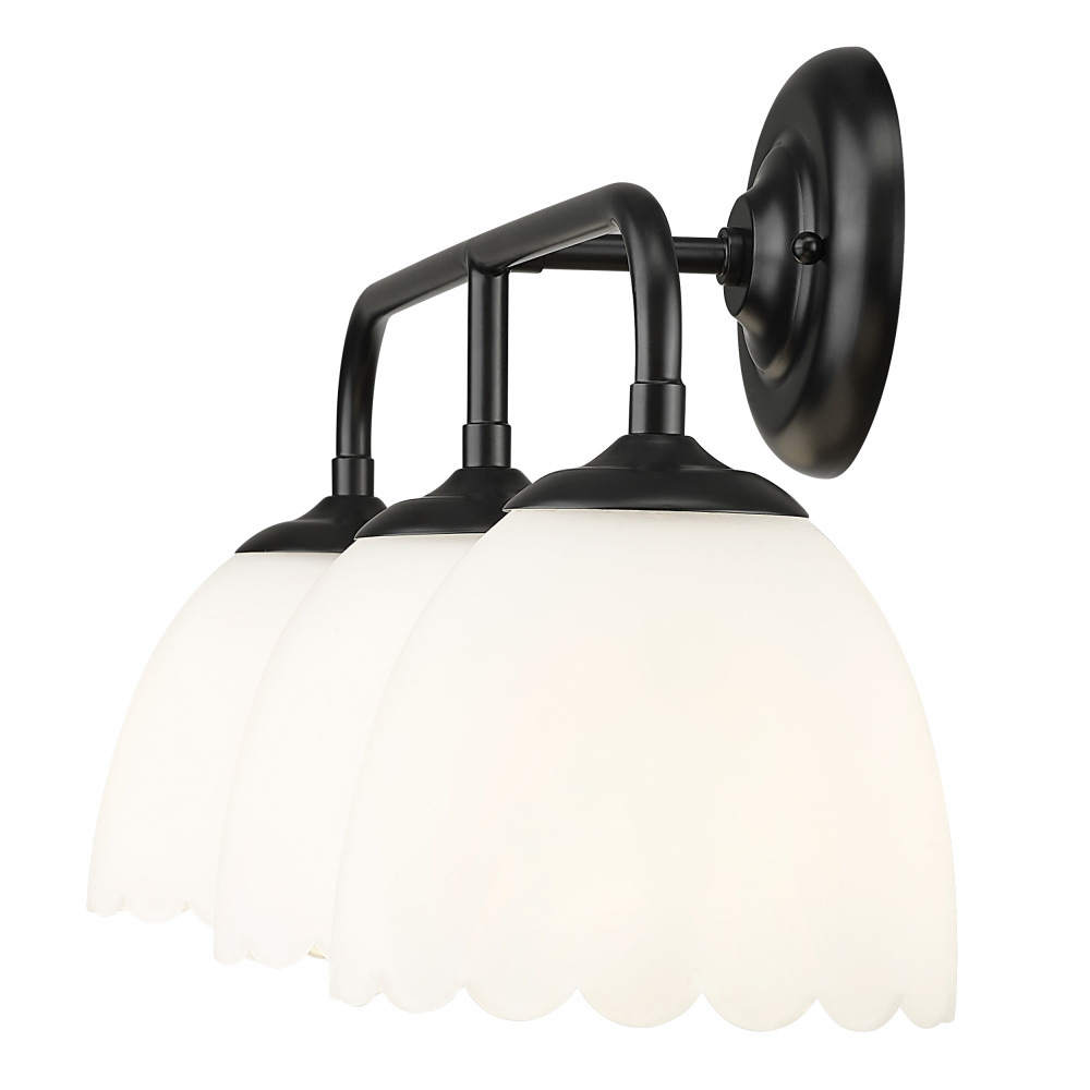 Bring transitional elegance into your home with the Golden Lighting Dorinda 3-light Vanity in Matte Black. Featuring a glass shade and a matte black frame, it creates a welcoming atmosphere. The opal glass shade is designed to diffuse light evenly, providing a soft, glare-free glow for any setting. With its deep black finish, this vanity light blends seamlessly into various decors, making it the ideal solution for a modern bathroom. It is damp location rated, suitable for covered and semi-enclosed spaces like bathrooms and laundry rooms. Requires 3 E26 medium base bulbs (not included) with a maximum wattage of 100. Overall dimensions are 24.5"W x 11"H x 7.5"D. Elevate your bathroom space with high-quality lighting that merges functionality and style.