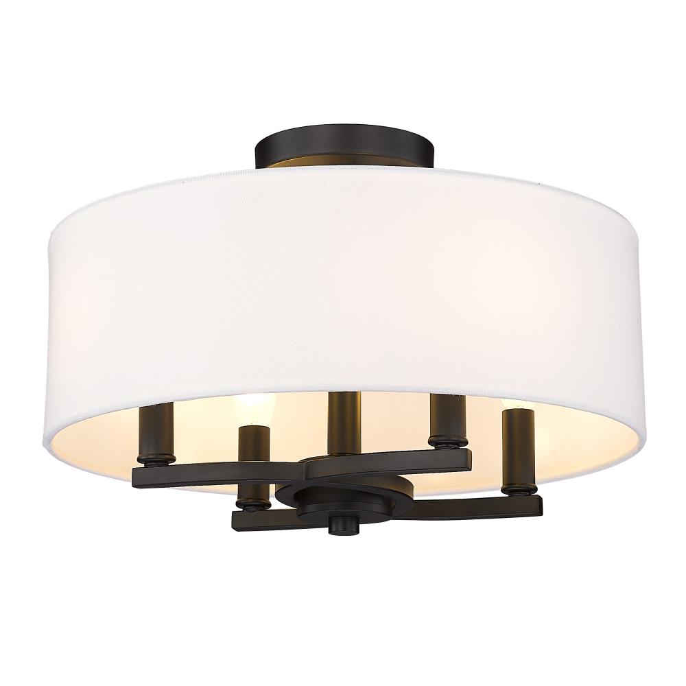 Bring a touch of industrial elegance into your home with the Golden Lighting Eliana 4-light Semi-Flush Mount in Matte Black. This striking fixture merges a soft fabric shade with a clean, contemporary frame, making it a perfect choice for various decor styles. The modern white fabric shade encircles the candelabra base, delivering a soft and diffused glow that creates a welcoming atmosphere. Its Matte Black finish enhances the overall aesthetic, offering a smooth, non-reflective quality that seamlessly blends with minimalistic to bold interiors. Damp location rated for versatility, the Eliana is suitable for covered areas including entryways, kitchens, and living rooms. Overall Dimensions: 15.5"W x 10.13"H x 15.5"D. Requires 4 E12 Candelabra base bulbs (not included), max 60 watts each, to illuminate your space beautifully. Elevate your home lighting with the Golden Lighting Eliana, it's the ideal fusion of style and practicality.