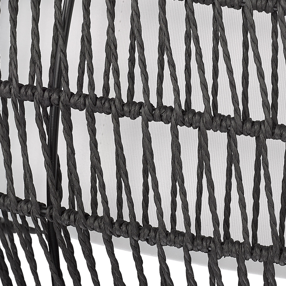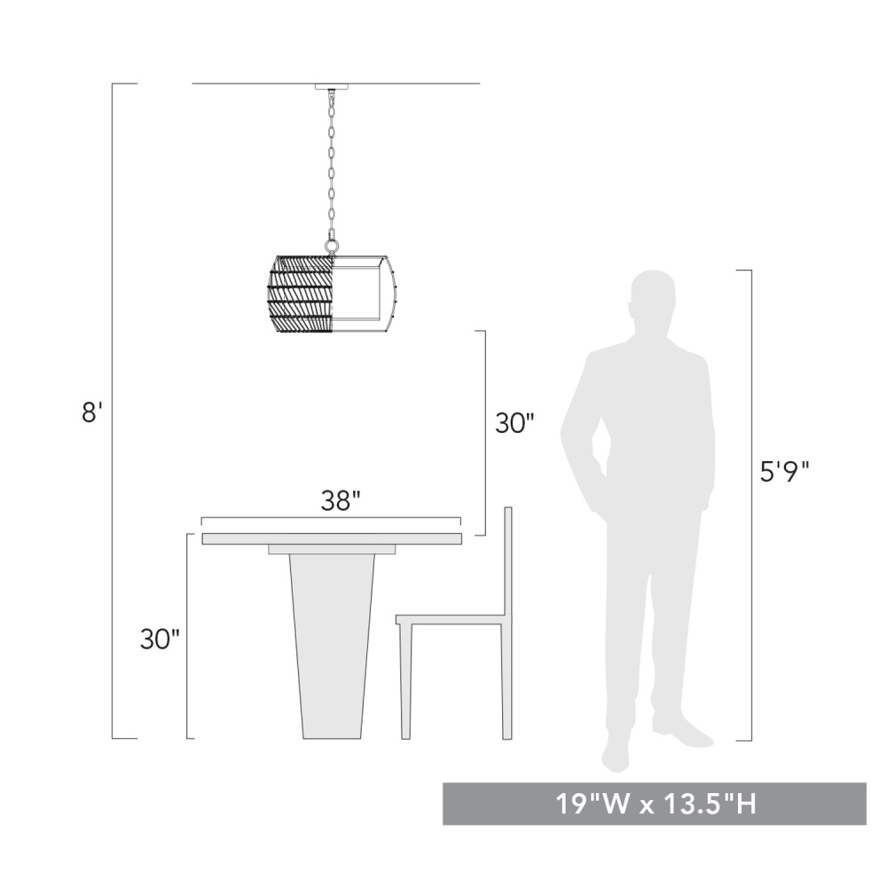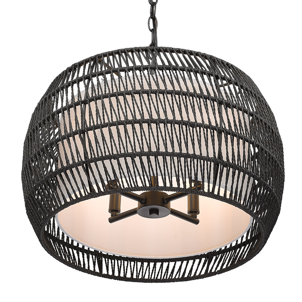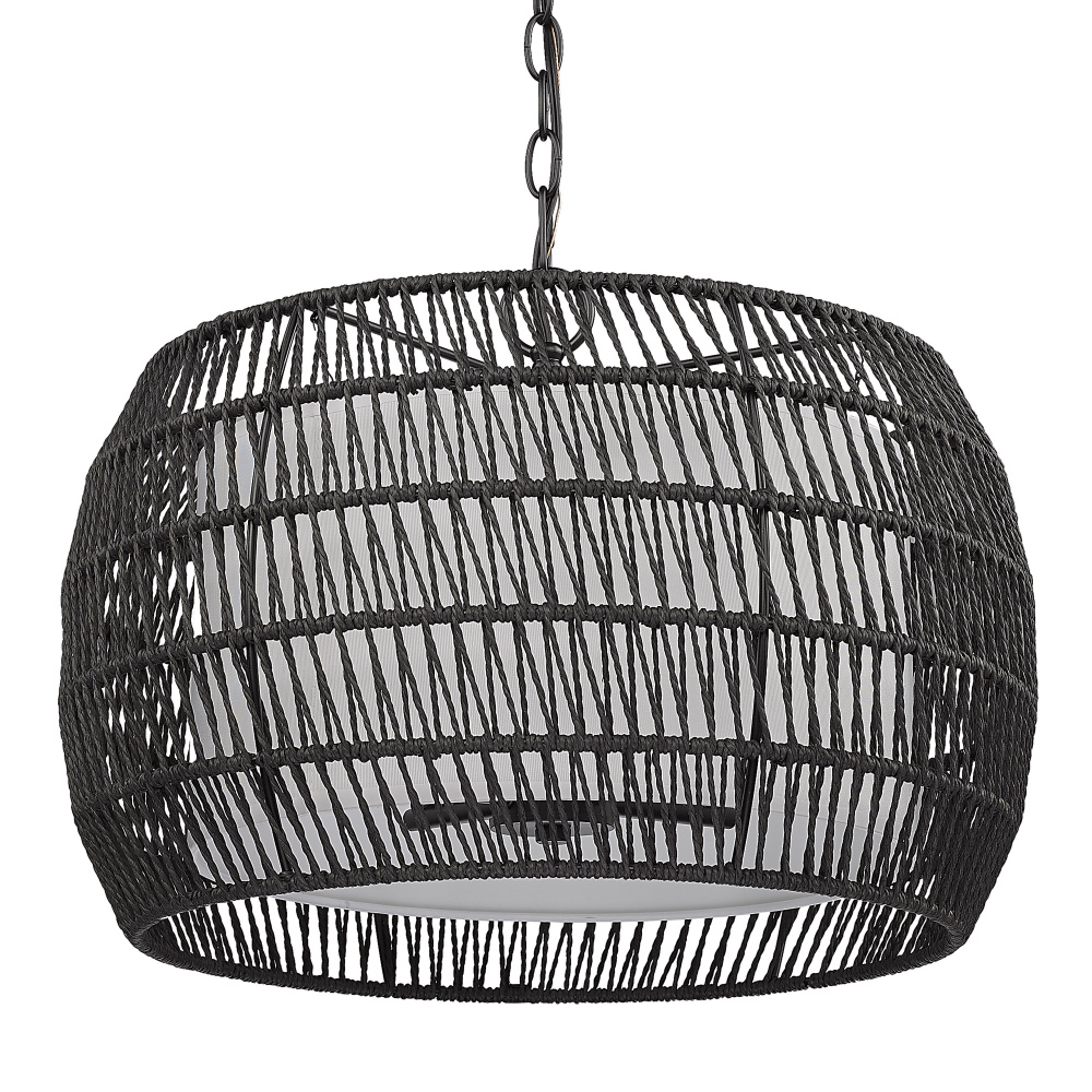 Bring coastal elegance into your home with the Golden Lighting Everly 4-light Pendant. Featuring a modern black rattan shade and a Matte Black frame, it creates an inviting atmosphere. The modern black rattan shade, made of a soft black twisted cord, showcases an open, textural design that plays beautifully with light and shadow. This unique shade adds a sophisticated yet organic element to your decor. Damp location rated, this pendant is suitable for covered and semi-enclosed spaces, ideal for kitchens, dining rooms, entryways, and more. Easily install on sloped ceilings and customize the hanging length (Min: 16.75"- Max: 88.75"). Dimensions: Overall Dimensions: 19"W x 13.5"H x 19"D. This fixture requires 4 E12 Candelabra base bulbs (not included) with a maximum wattage of 60. Elevate your space with a touch of bohemian-inspired charm—where contemporary style meets natural elegance.