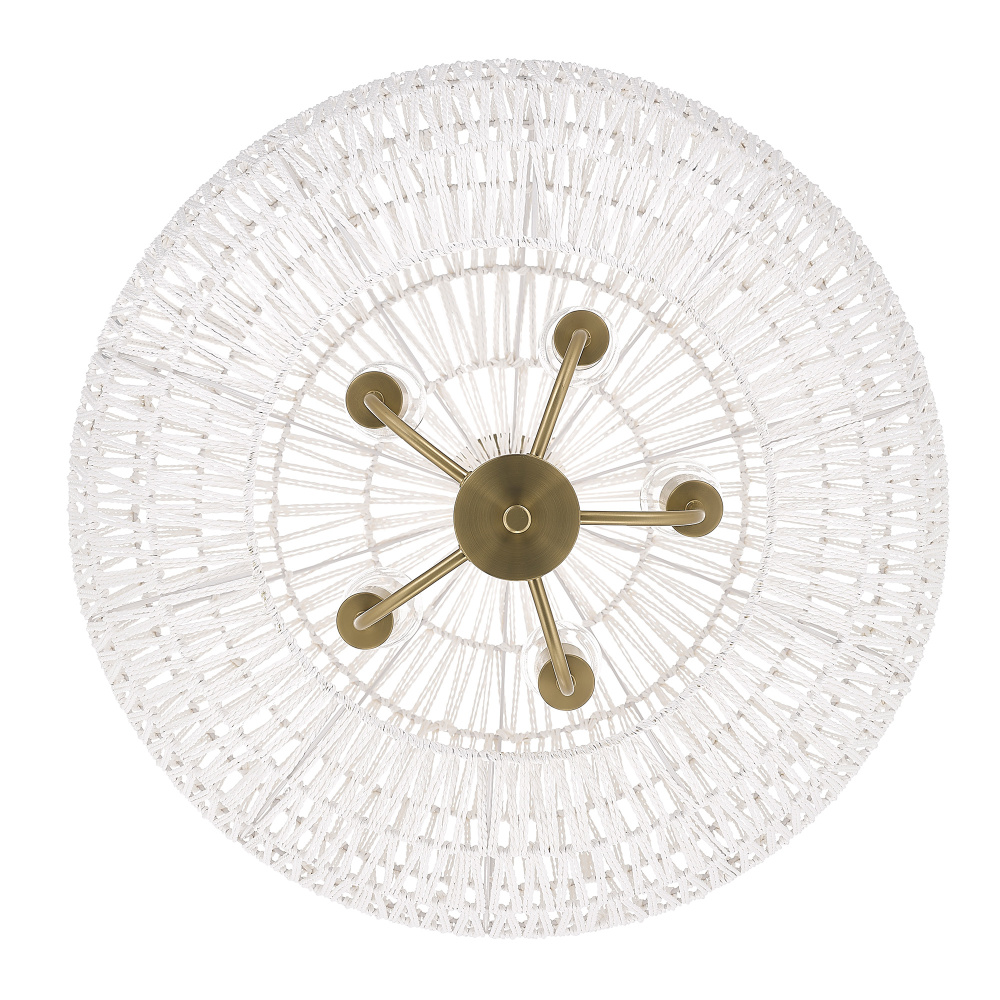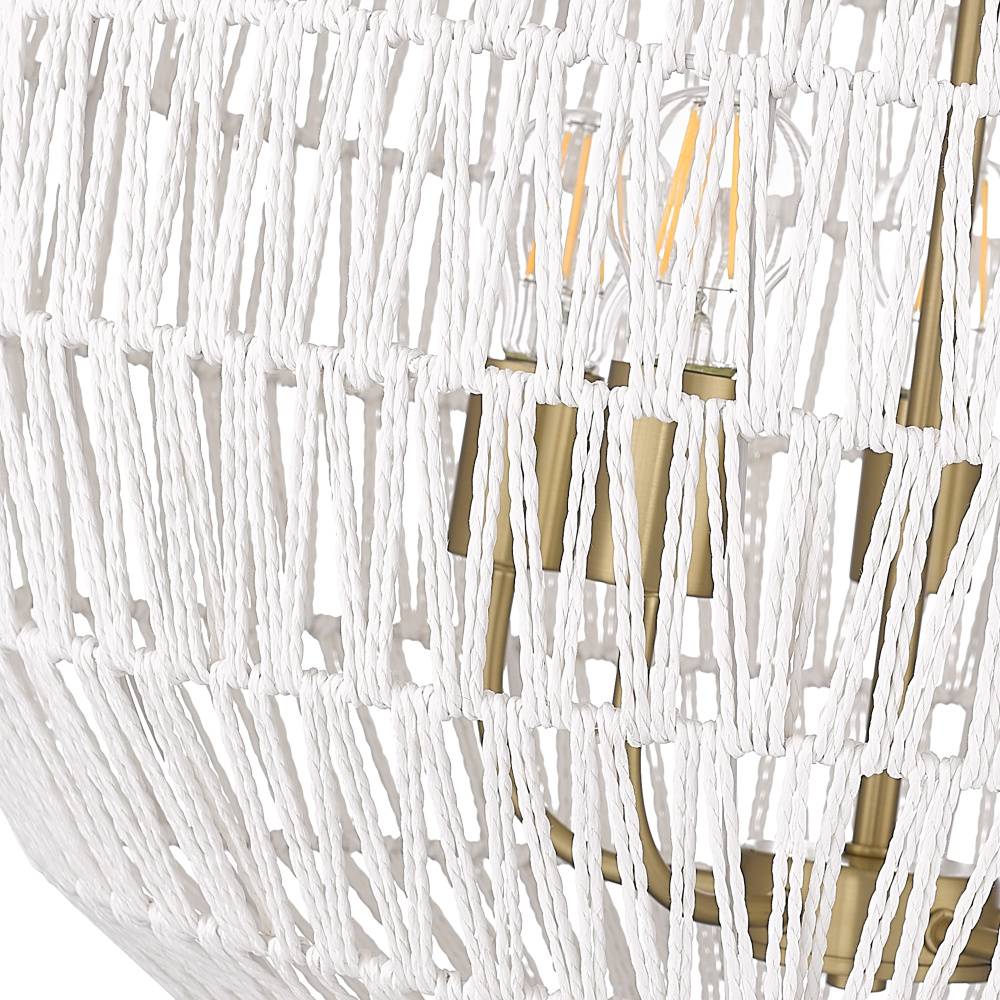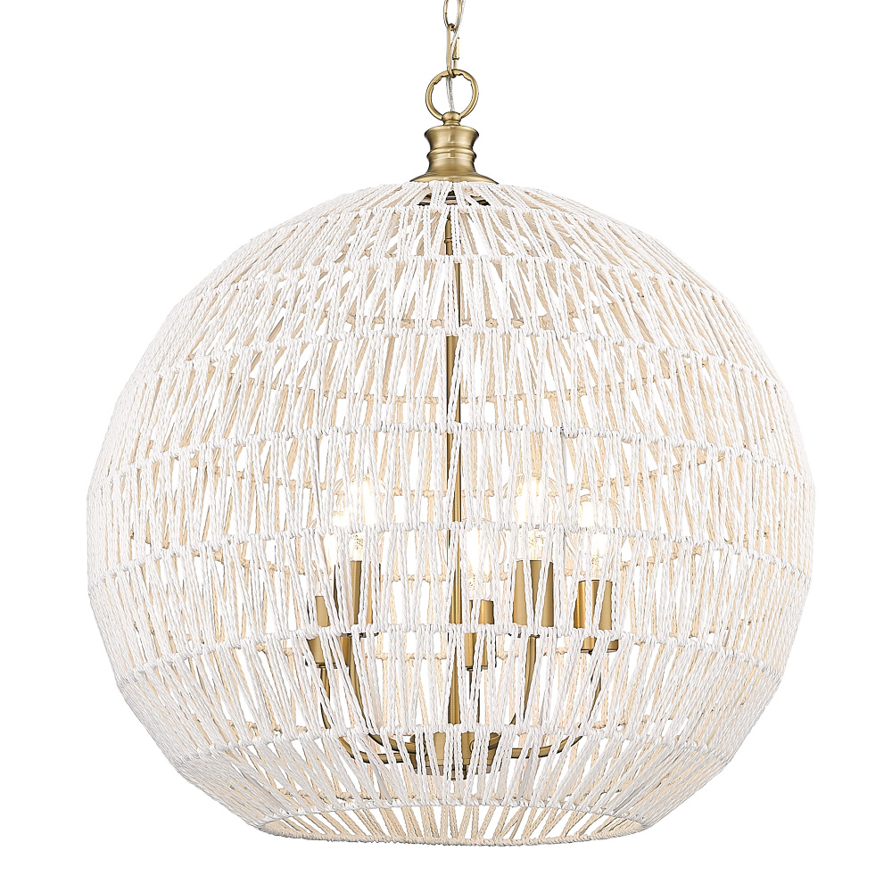 Bring nature-inspired elegance into your home with the Golden Lighting Florence 5-light Pendant. Featuring a Rope shade and a Brushed Champagne Brass frame, it creates a welcoming atmosphere. The natural Rope shade adds a breezy, coastal vibe, crafted from Bleached White Raphia Rope, which provides a highly textural appearance, integrating light beautifully into your space. The Brushed Champagne Brass finish offers an understated, elegant alternative to traditional gold, enhancing your decor with a touch of quiet luxury and contemporary style. Ideal for kitchens, dining rooms, or bedrooms—perfect for focused yet decorative illumination in entryways, foyers, or even bathrooms. Dry Location Rated, it’s suitable for indoor spaces not subject to moisture. Installation is made easy with its sloped-ceiling compatibility and adjustable height options ( Min: 31.375"- Max: 104.75"). Overall Dimensions: 24.88"W x 27.38"H x 24.88"D, Requires 5 E26 Medium base bulbs (not included, Max 60 watt per bulb). Transform your living space with this stunning pendant, exuding quality and charm, perfect for any bohemian-inspired interior.
