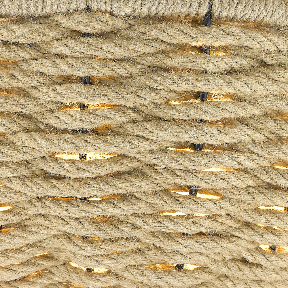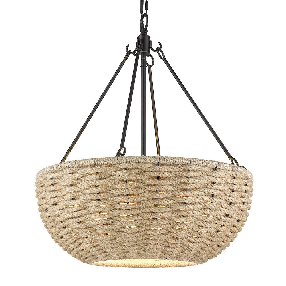 Bring traditional coastal elegance into your home with the Golden Lighting Hathaway 4-light Pendant in Matte Black. Featuring a rope shade and a matte black frame, it creates a welcoming atmosphere. The woven hemp rope shade showcases the raw beauty of nature, expertly hand-woven to create a substantial texture. Light filters gently through the weave, casting a soft, inviting glow that enhances any space. The matte black finish is timeless and versatile, with a smooth, non-reflective surface that absorbs light, imparting a sophisticated look to your decor. Ideal for kitchens, dining rooms, and even entryways, this pendant light is damp location rated, making it suitable for covered spaces with occasional moisture. It is sloped-ceiling compatible and features an adjustable height, ranging from 27.75" to a maximum of 99.75". Overall dimensions are 20.25"W x 24.25"H x 20.25"D, requiring four E26 medium base bulbs (not included) with a maximum wattage of 100 per bulb. Elevate your space with this stunning fixture that blends quality craftsmanship with stylish design.