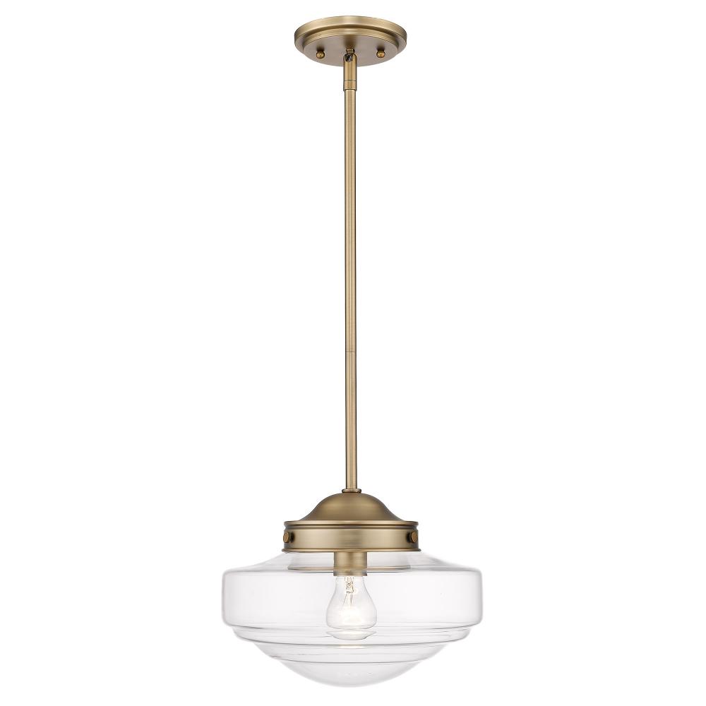 Bring elegance into your home with the Golden Lighting Ingalls 1-light 12in Pendant. Featuring a clear glass shade and a modern brass frame, it creates a sophisticated atmosphere. The clear glass shade provides unobstructed light, highlighting the design while offering a clean, timeless appeal. The modern brass finish gives a muted, warm patina ideal for both modern and traditional interiors. This pendant light is suitable for covered and semi-enclosed spaces, easily installable on angled ceilings with an adjustable height ranging from 11.25" to 53.25". Overall dimensions are 12"W x 8.5"H x 12"D, and it requires one E26 medium base bulb (not included) with a maximum wattage of 100. Enhance your decor with this exquisite pendant fixture that brings style and quality to any space.