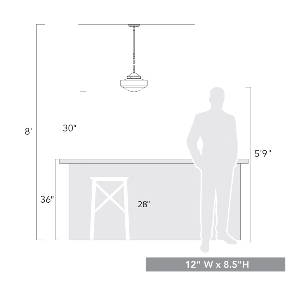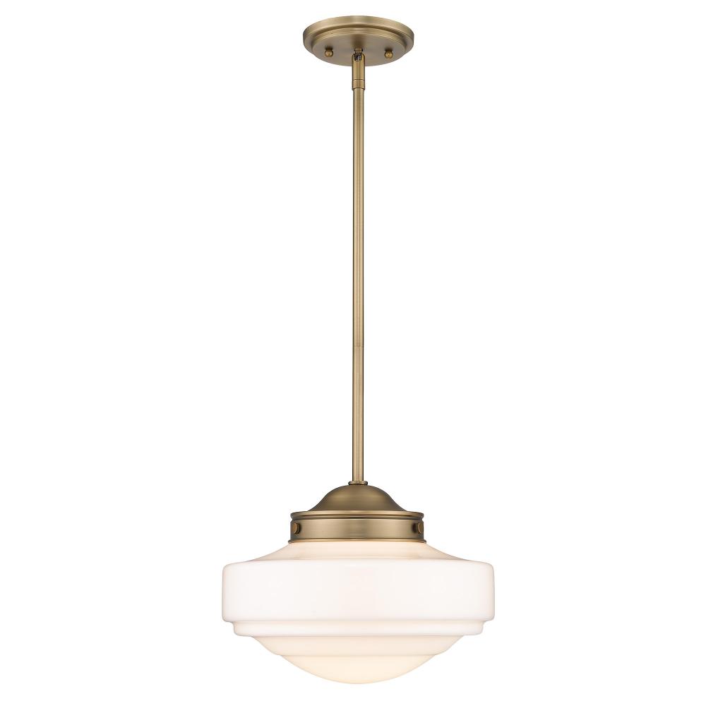 Bring timeless charm into your home with the Golden Lighting Ingalls 1-light 12in Pendant. Featuring a vintage milk glass shade and a modern brass frame, it creates a nostalgic atmosphere. The vintage Milk Glass shade emits a warm, glare-free glow, perfect for spaces seeking comfort and history. The modern brass finish offers a subtle elegance that harmonizes with both contemporary and classic interiors. This pendant is suitable for covered and semi-enclosed spaces and can be installed on angled ceilings with an adjustable height from 11.25" to 53.25". Overall dimensions are 12"W x 8.5"H x 12"D, and it requires one E26 medium base bulb (not included) with a maximum wattage of 100. Infuse your home with quality, craftsmanship, and iconic style with this extraordinary lighting fixture.