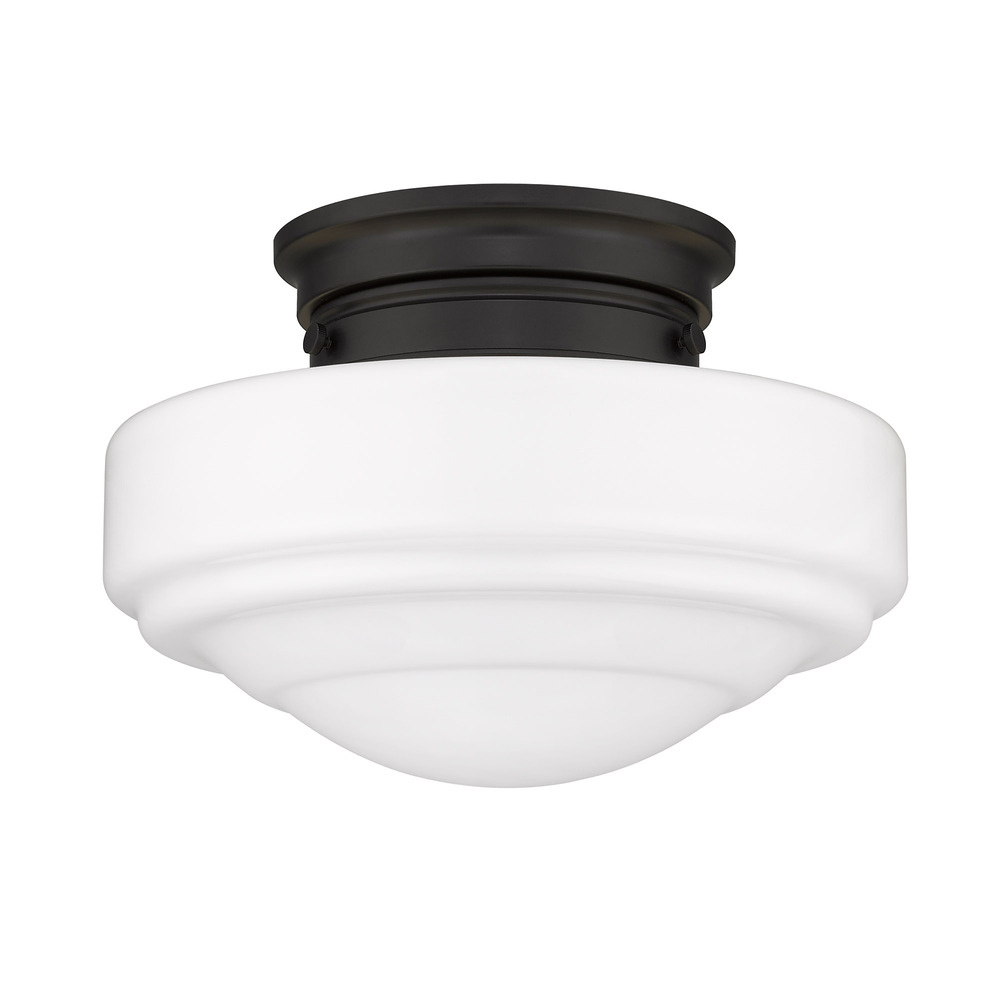 Bring traditional elegance into your home with the Golden Lighting Ingalls 1-light 12in Semi-Flush Mount. Featuring a vintage milk glass shade and a sleek matte black frame, it creates a welcoming atmosphere. The vintage milk glass shade provides a soft, luminous glow, reminiscent of classic schoolhouse designs. Its opaque finish adds a touch of nostalgia while ensuring a glare-free ambiance, perfect for evening relaxation. The matte black finish offers a sophisticated non-reflective surface that complements a wide array of decors, making it a versatile choice. Ideal for entryways, bedrooms, kitchens, and living areas, this fixture is damp location rated, suitable for covered spaces with occasional moisture. Uses 1 E26 Medium base bulb (not included). Max 100 wattage per bulb, ensuring bright illumination in any space. With overall dimensions of 12"W x 8.63"H x 12"D, this piece not only provides illumination but enhances your interiors with its quality craftsmanship and artistic flair.